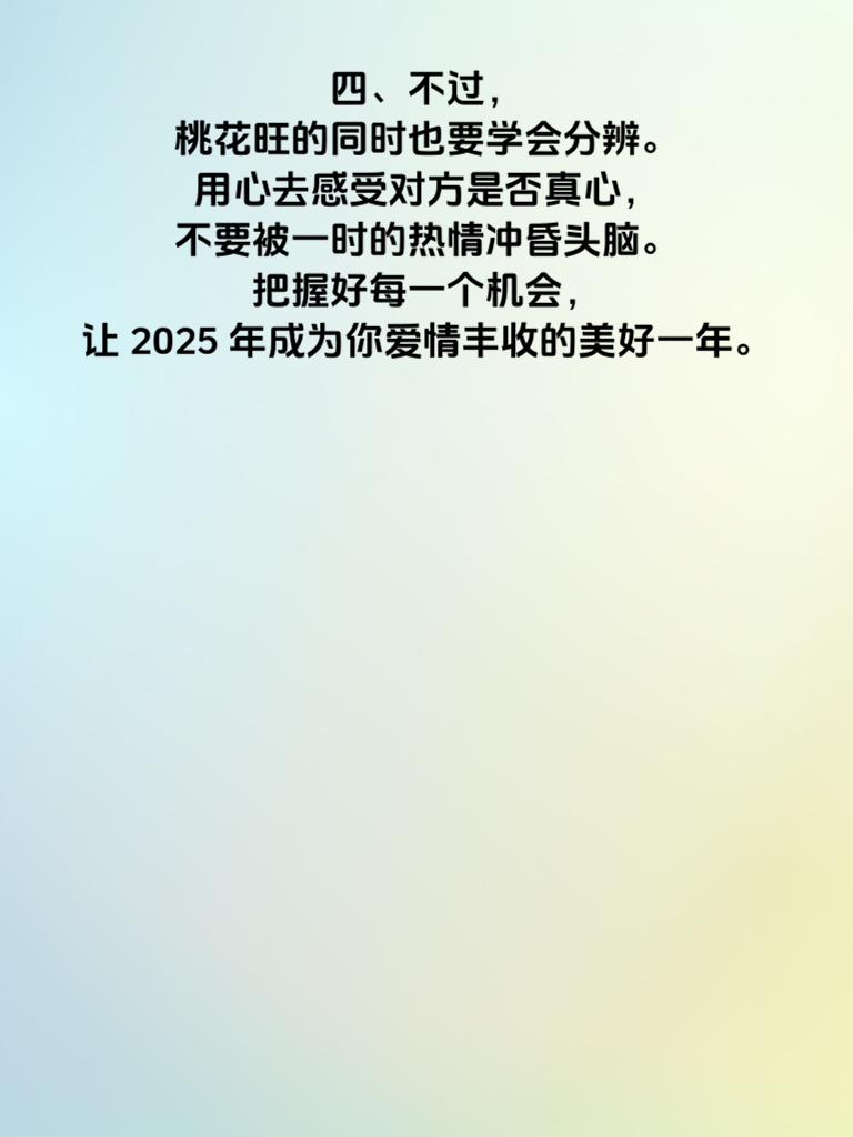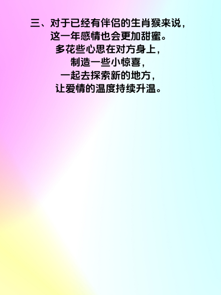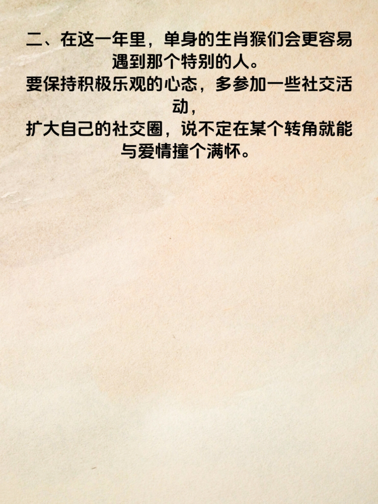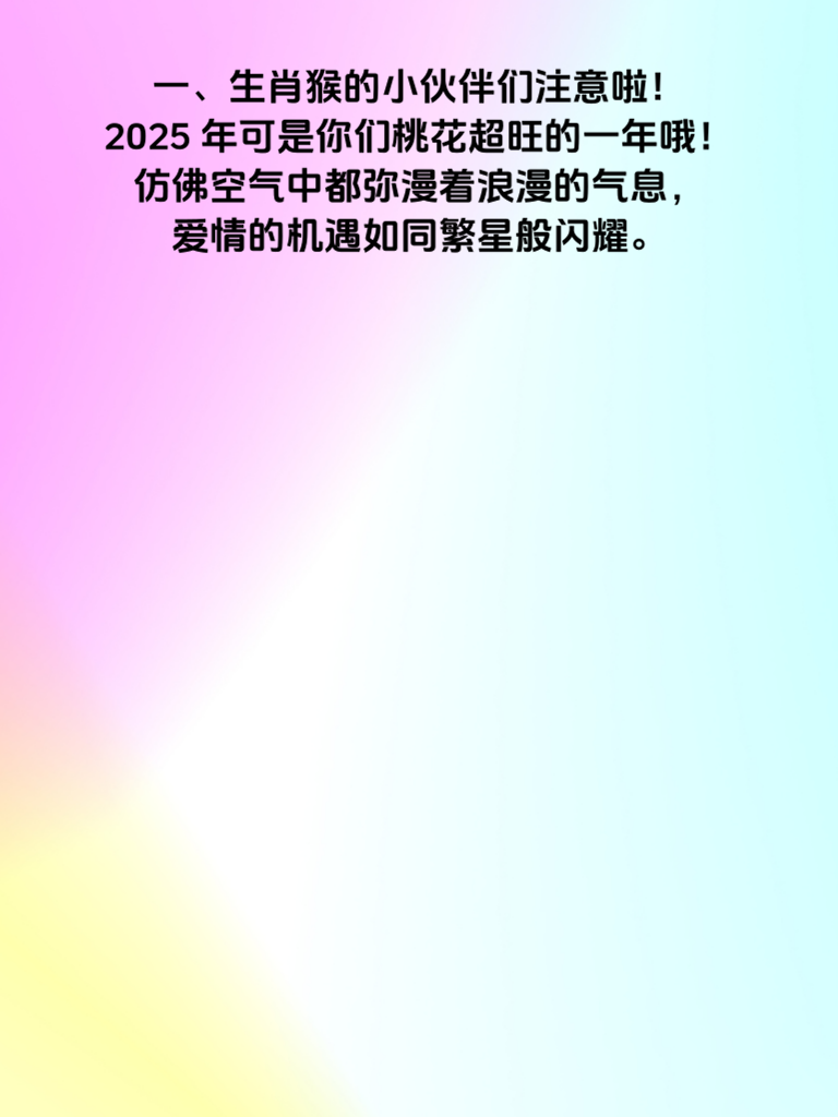 一、生肖猴的小伙伴们注意啦!2025 年可是你们桃花超旺的一年哦!仿佛空气中都弥漫着浪漫的气息,爱情的机遇如同繁星般闪耀。 二、在这一年里,单身的生肖猴们会更容易遇到那个特别的人。要保持积极乐观的心态,多参加一些社交活动,扩大自己的社交圈,说不定在某个转角就能与爱情撞个满怀。 三、对于已经有伴侣的生肖猴来说,这一年感情也会更加甜蜜。多花些心思在对方身上,制造一些小惊喜,一起去探索新的地方,让爱情的温度持续升温。 四、不过,桃花旺的同时也要学会分辨。用心去感受对方是否真心,不要被一时的热情冲昏头脑。把握好每一个机会,让 2025 年成为你爱情丰收的美好一年。