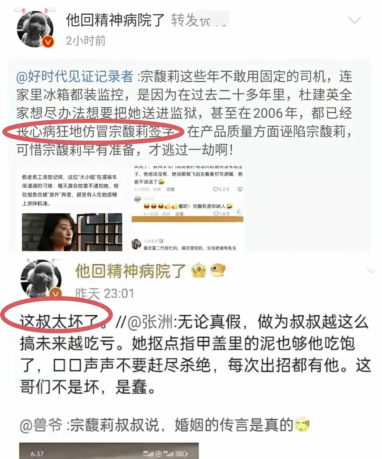 睡觉前,又刷到猛料:宗馥莉叔叔与姑姑都是后妈生的,后妈目前在世。 难怪宗泽后一直诋毁宗馥莉,一直帮助杜三,说宗馥莉不和宗家其他亲戚往来!这些行为现在都能解释得通了! 还有那个导演高群书,揭露了更恐怖的内幕,她说长公主之所以经常换司机,在冰箱安装摄像头,是因为过去20多年,杜建英一直在想方设法,送长公主进监狱,而且,还丧心病狂地模仿过她的签字,以此诬陷宗馥莉。 太可怕了!难怪,前两天看过长公主的一个采访。记者问她,你最大的成就是什么。她说,我活着就是最大的成就。现在有点理解这句话的含义了!