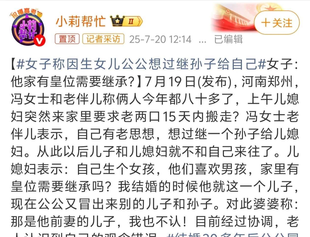 一女子说:因为生的是女儿,公公想过继孙子给自己。 郑州有个儿媳妇,结婚后和丈夫只生了个女儿。结果最近,她公公突然提了个让她接受不了的要求。 公公想把他自己之前一段婚姻里生的儿子的孩子过继给她,相当于让这个男孩当她的孩子。 公公这么做其实就是老思想作祟,觉得家里必须得有男孩“传宗接代”,担心只有孙女的话,将来家里的房子没人“继承香火”,觉得女孩不算数。 儿媳妇对此特别反对:当初结婚时明明说丈夫是独生子,过了30年突然冒出别的儿子和孙子,现在还要用这种方式硬塞个男孩,这不就是明摆着重男轻女、看不起她生女儿吗? 后来经过媒体劝说,公公嘴上承认自己观念错了,但儿媳妇和儿子气不过,现在已经不跟老两口来往了。