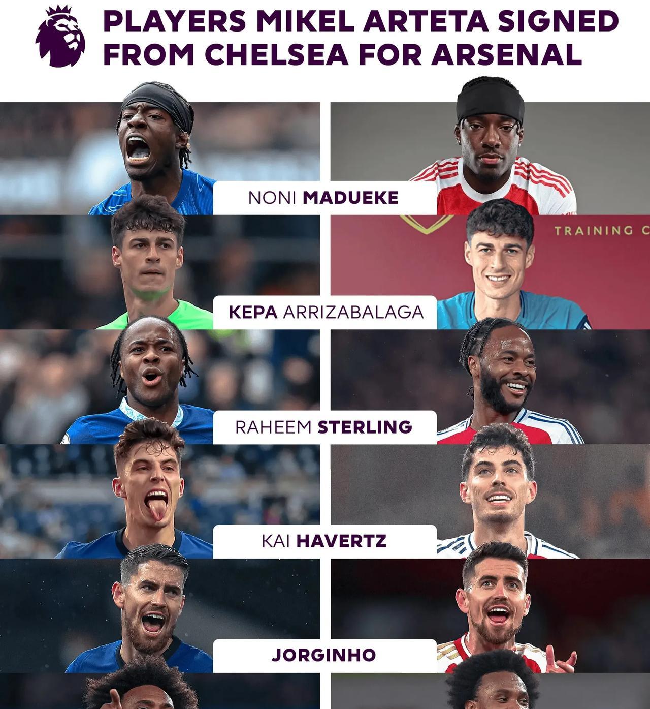 6个字总结阿森纳近年转会:切尔西,西班牙 阿尔特塔在2019年成为阿森纳主教练,已经执教6个赛季,28笔引援,对切尔西和西班牙球员情有独钟。 从切尔西签下或租借了6名球员,包括威廉、若日尼奥、斯特林、哈弗茨、凯帕和马杜埃凯,总计转会费约1.5亿欧元。 西班牙裔的5名球员:巴勃罗·马里、梅里诺、凯帕、祖比门迪、莫斯克拉,总计花销超过1.3亿欧元。阿尔特塔本人也是西班牙人。#阿森纳队# #英超转会风向# #阿尔特塔#