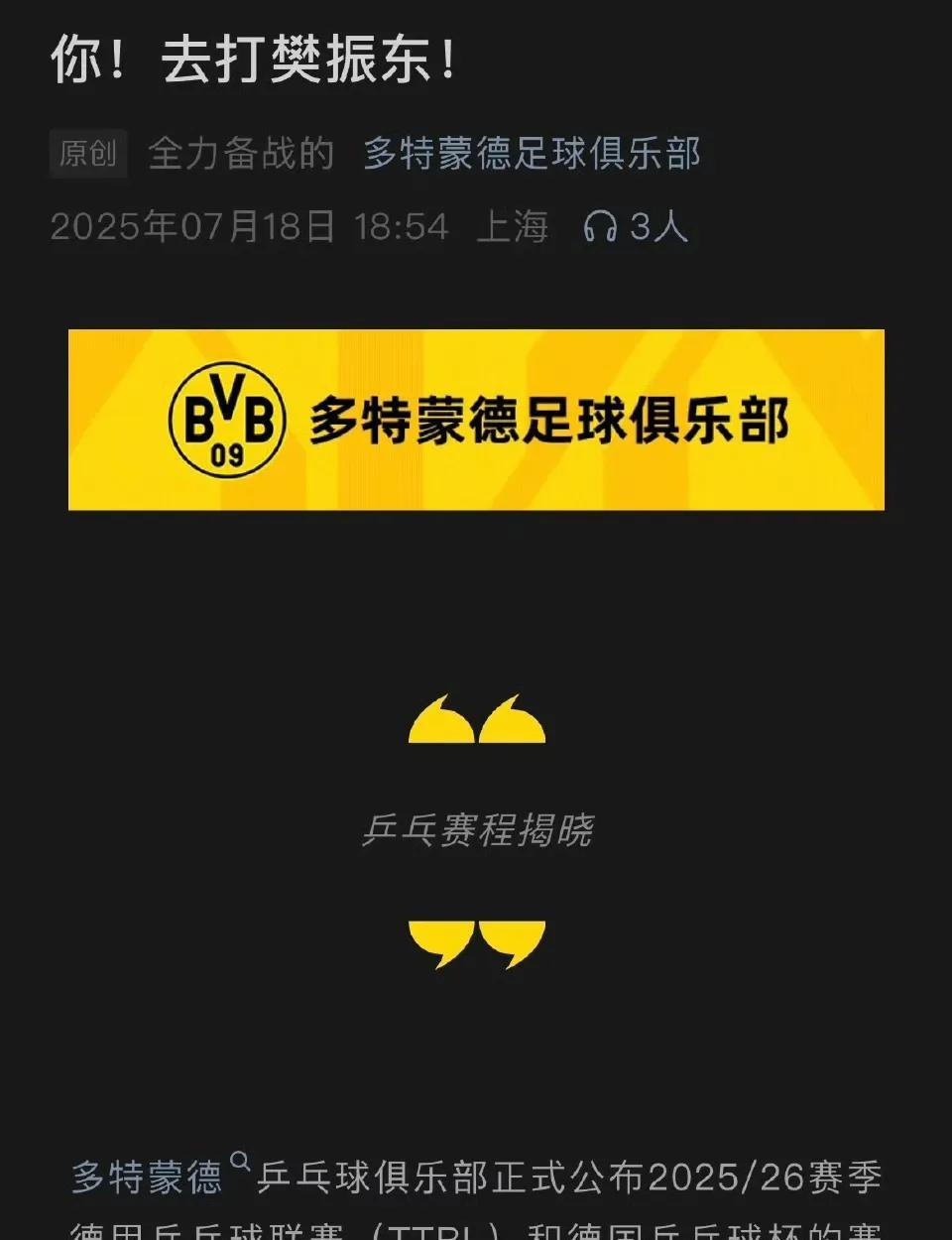 樊振东真的太令人骄傲了! 加盟德甲后,不仅萨尔布吕肯俱乐部把东东当成了宝贝疙瘩,而且对手也开始宣传东东了! 多特蒙德俱乐部一句简单的文案:“你!去打樊振东!”说明了一切。 果然有樊振东亮相的关键比赛就是门票保障、高光时刻,连对手都满心喜欢和敬佩,这就是体坛巨星的魅力。 9月14号德甲萨尔对多特蒙德,东哥上场; 9月19号德国杯开幕战,还是萨尔对多特蒙德,东哥上场。 一周两战,让我们一起期待东东的精彩表现吧!