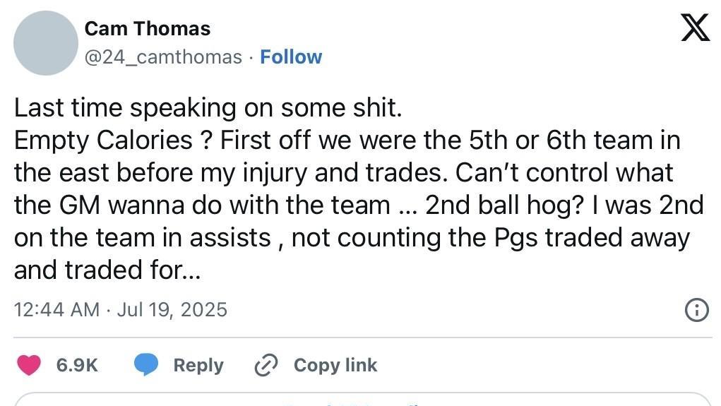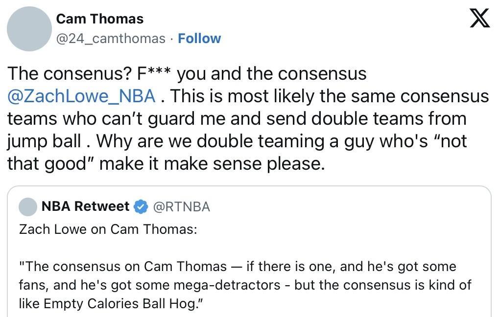 被称为“0卡路里球霸”?篮网小托马斯发声回应 近日,知名媒体The Ringer的Zach Rowe表示:关于篮网的卡姆-托马斯,如果有什么共识的话,那么就是“0卡路里球霸”。 对此本人回应称: “共识?既然达成共识为什么从跳球开始就要包夹我?跟我说说为什么要包夹一个’看起来不怎么样’的球员? 第一关于0卡路里,在我受伤前,篮网排名东部第5还是第6,篮网总经理要做什么是我能控制的吗? 第二关于球霸,我助攻排球队第二,不算那些交易来、交易走的控卫的话…” 此前报道,受限自由球员卡姆-托马斯与篮网在续约谈判上进展缓慢。篮网为其开出599万美元的资质报价,本人则希望得到3000万美元年薪合同。他上赛季出场25场比赛场均24.0分3.3板3.8助,但防守和助攻为人诟病。 #NBA吐槽大会# #NBA#