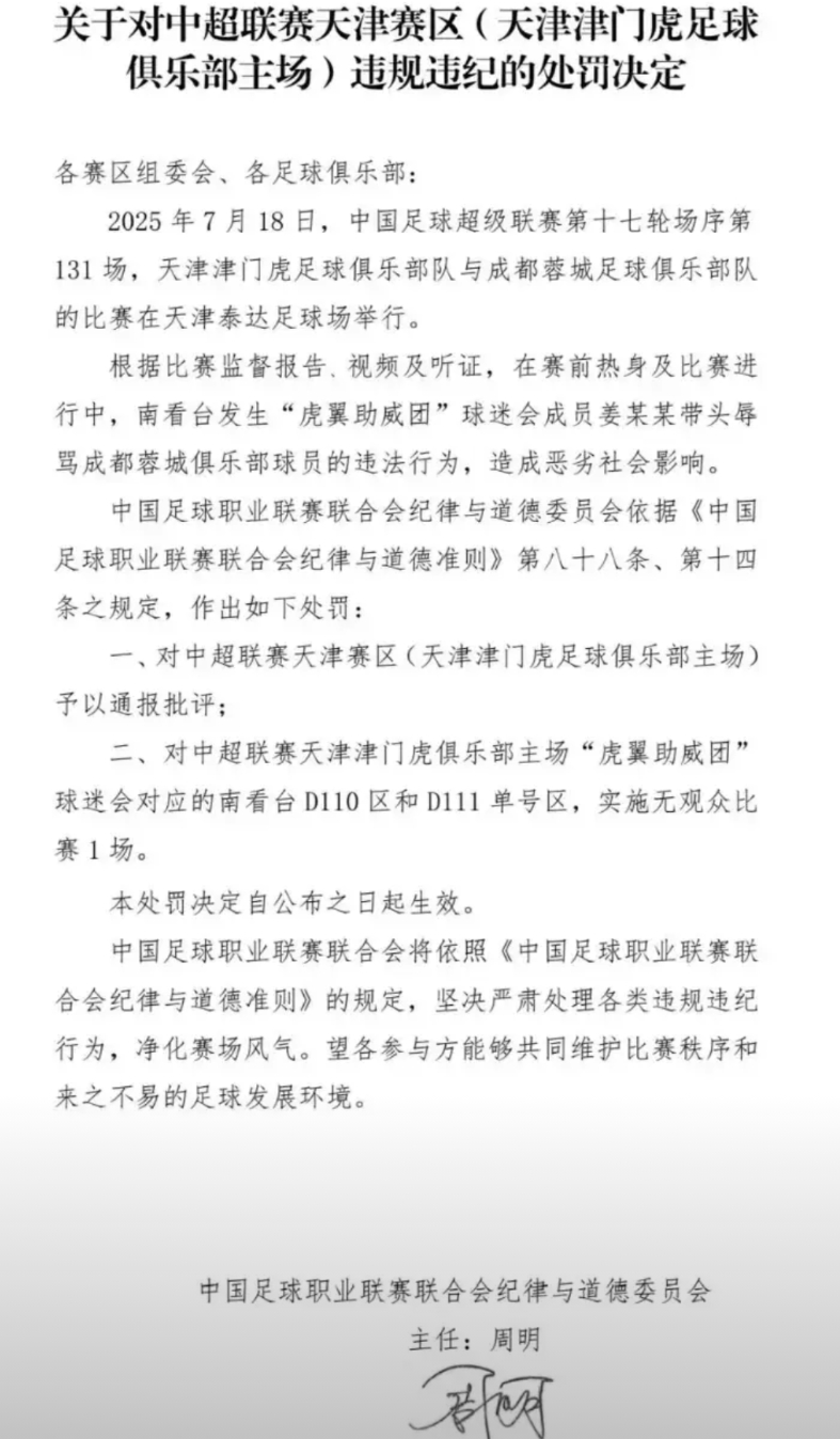一、对中超联赛天津赛区(天津津门虎足球俱乐部主场)予以通报批评;