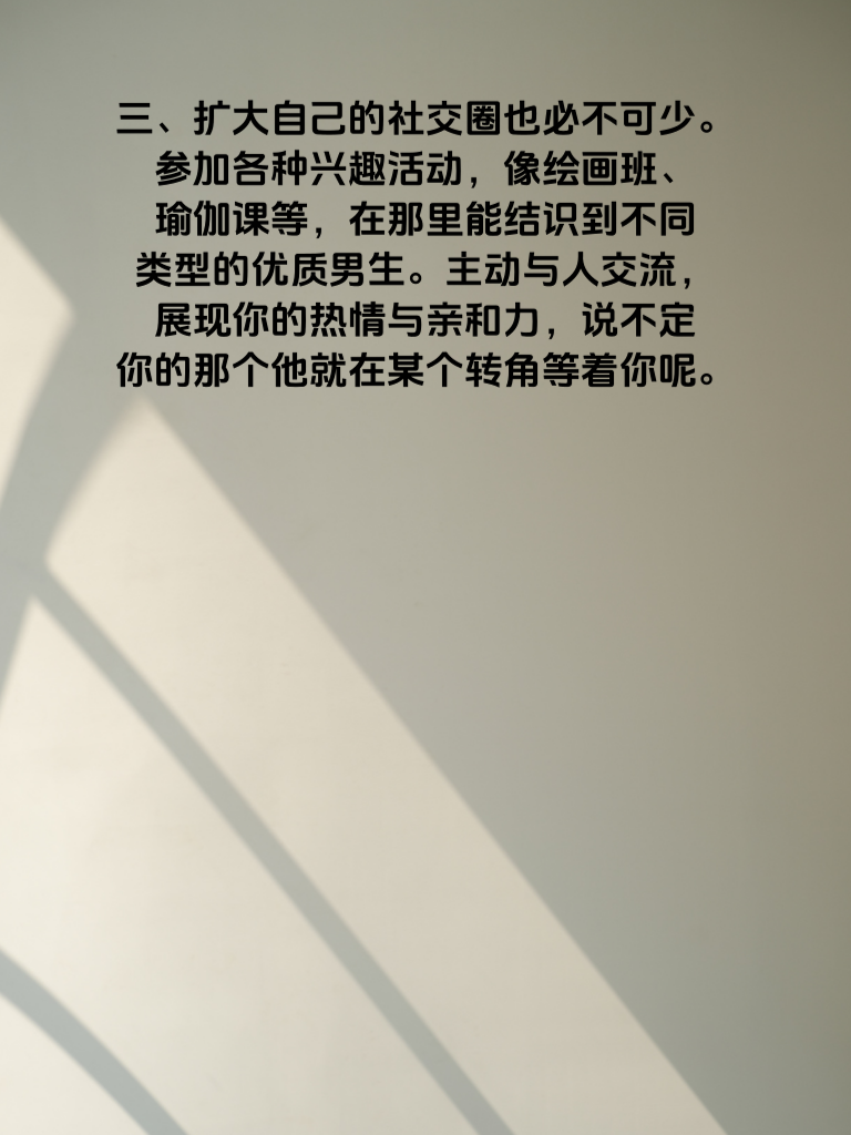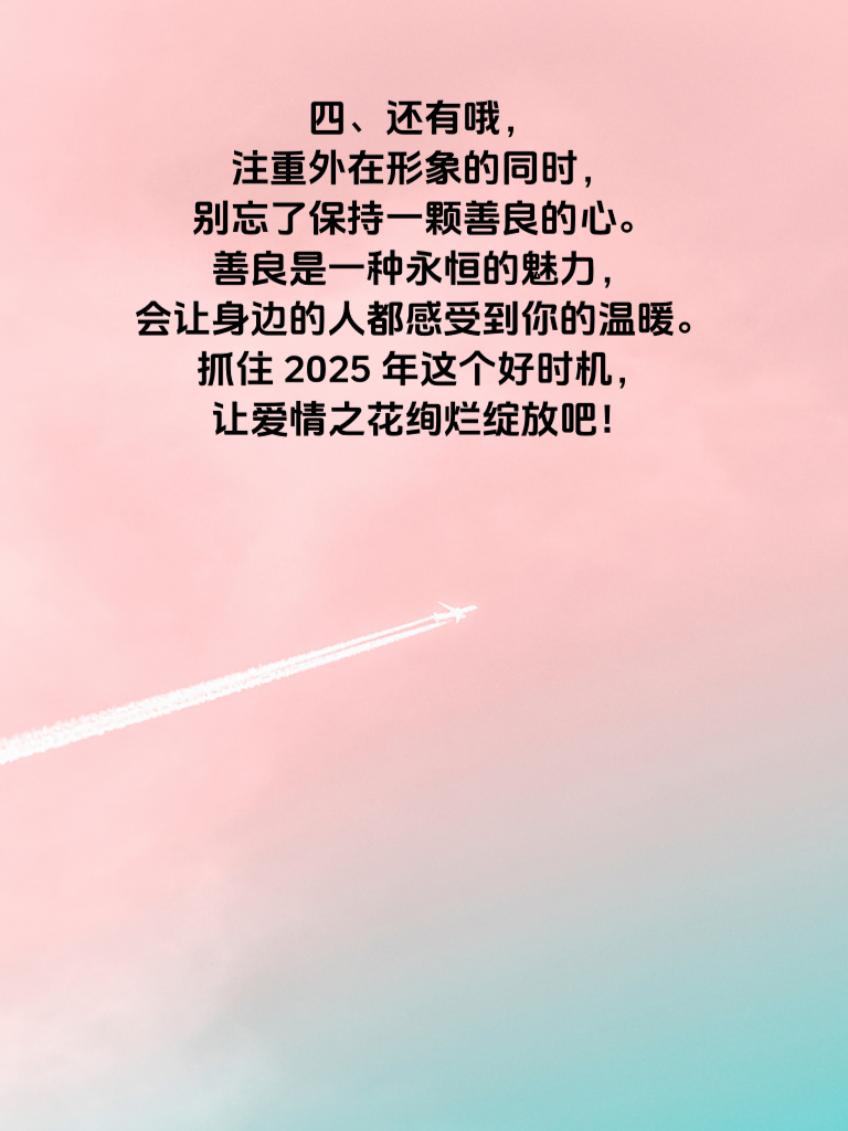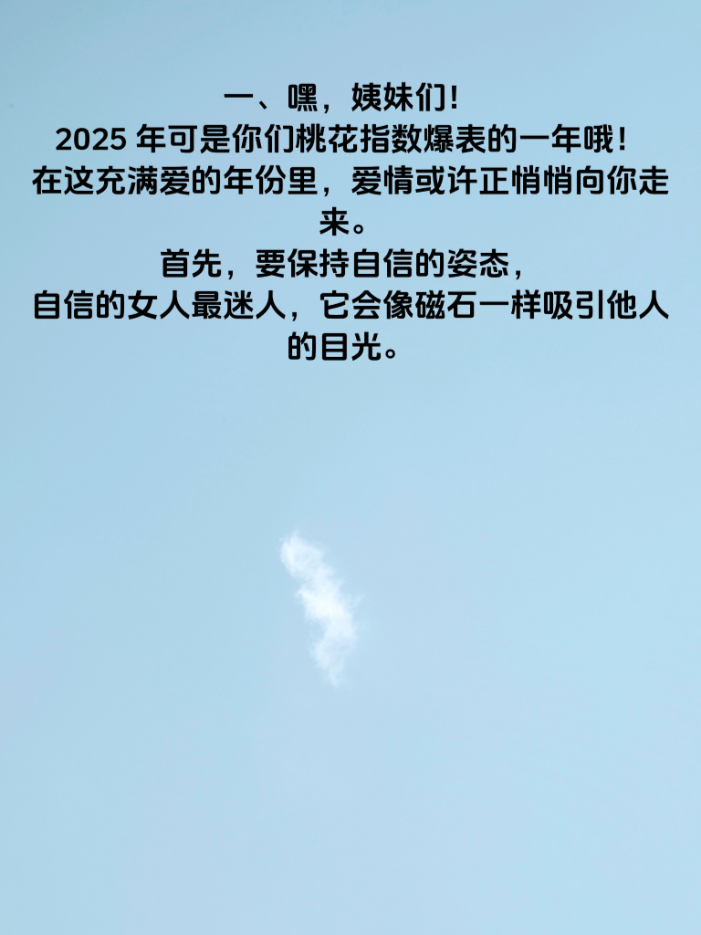 一、嘿,姨妹们!2025年可是你们桃花指数爆表的一年哦!在这充满爱的年份里,爱情或许正悄悄向你走来。首先,要保持自信的姿态,自信的女人最迷人,它会像磁石一样吸引他人的目光。 二、提升自己也很关键。不断学习新技能,比如学一门乐器,当你在音乐中陶醉时,那种独特的气质会让人心生好感。或者培养阅读的习惯,丰富内在,与人交流时更有内涵。 三、扩大自己的社交圈也必不可少。参加各种兴趣活动,像绘画班、瑜伽课等,在那里能结识到不同类型的优质男生。主动与人交流,展现你的热情与亲和力,说不定你的那个他就在某个转角等着你呢。 四、还有哦,注重外在形象的同时,别忘了保持一颗善良的心。善良是一种永恒的魅力,会让身边的人都感受到你的温暖。抓住2025年这个好时机,让爱情之花绚烂绽放吧!