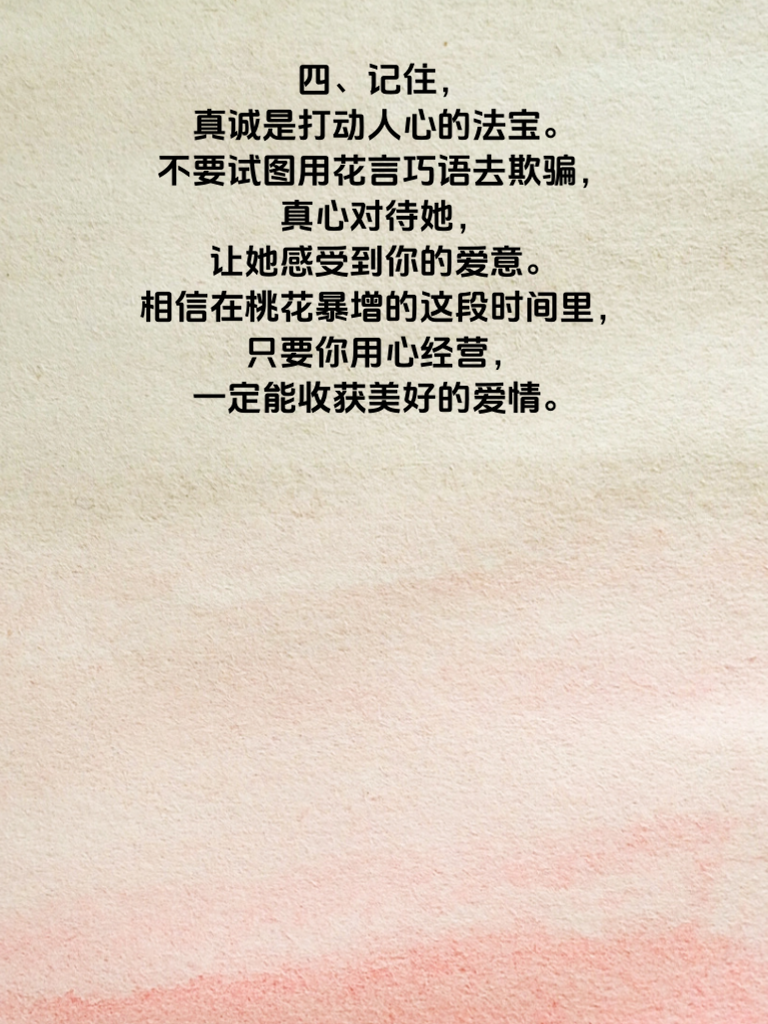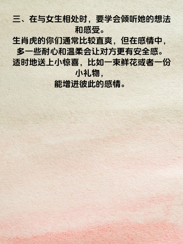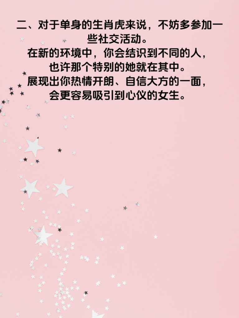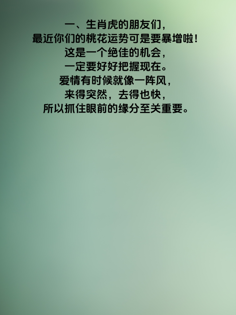 一、生肖虎的朋友们,最近你们的桃花运势可是要暴增啦!这是一个绝佳的机会,一定要好好把握现在。爱情有时候就像一阵风,来得突然,去得也快,所以抓住眼前的缘分至关重要。 二、对于单身的生肖虎来说,不妨多参加一些社交活动。在新的环境中,你会结识到不同的人,也许那个特别的她就在其中。展现出你热情开朗、自信大方的一面,会更容易吸引到心仪的女生。 三、在与女生相处时,要学会倾听她的想法和感受。生肖虎的你们通常比较直爽,但在感情中,多一些耐心和温柔会让对方更有安全感。适时地送上小惊喜,比如一束鲜花或者一份小礼物,能增进彼此的感情。 四、记住,真诚是打动人心的法宝。不要试图用花言巧语去欺骗,真心对待她,让她感受到你的爱意。相信在桃花暴增的这段时间里,只要你用心经营,一定能收获美好的爱情。