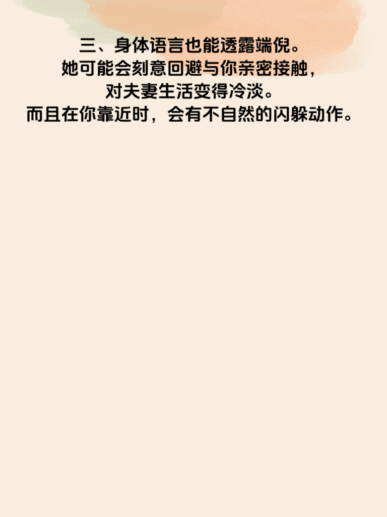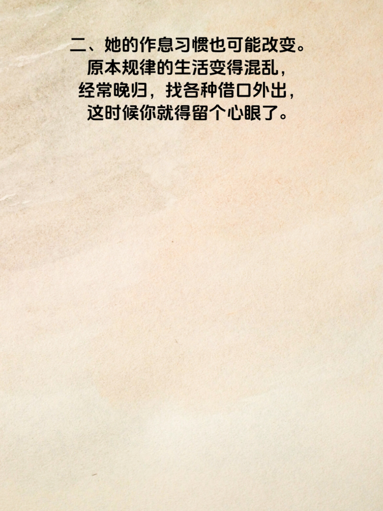 一、婚姻中,女人出轨前身体可能会出现一些微妙信号。当她突然开始注重外表,频繁购买新衣服、更换发型,或许并非只是为了取悦你,而是另有隐情。 二、她的作息习惯也可能改变。原本规律的生活变得混乱,经常晚归,找各种借口外出,这时候你就得留个心眼了。 三、身体语言也能透露端倪。她可能会刻意回避与你亲密接触,对夫妻生活变得冷淡。而且在你靠近时,会有不自然的闪躲动作。