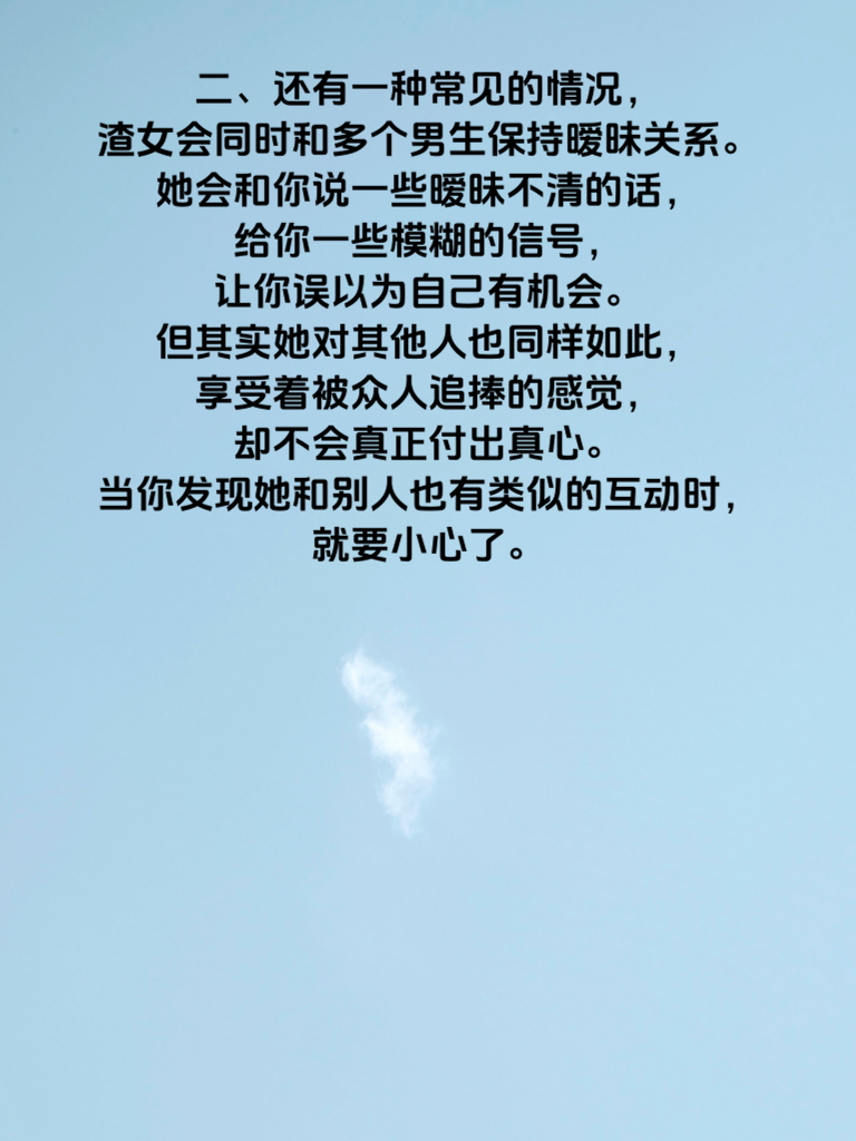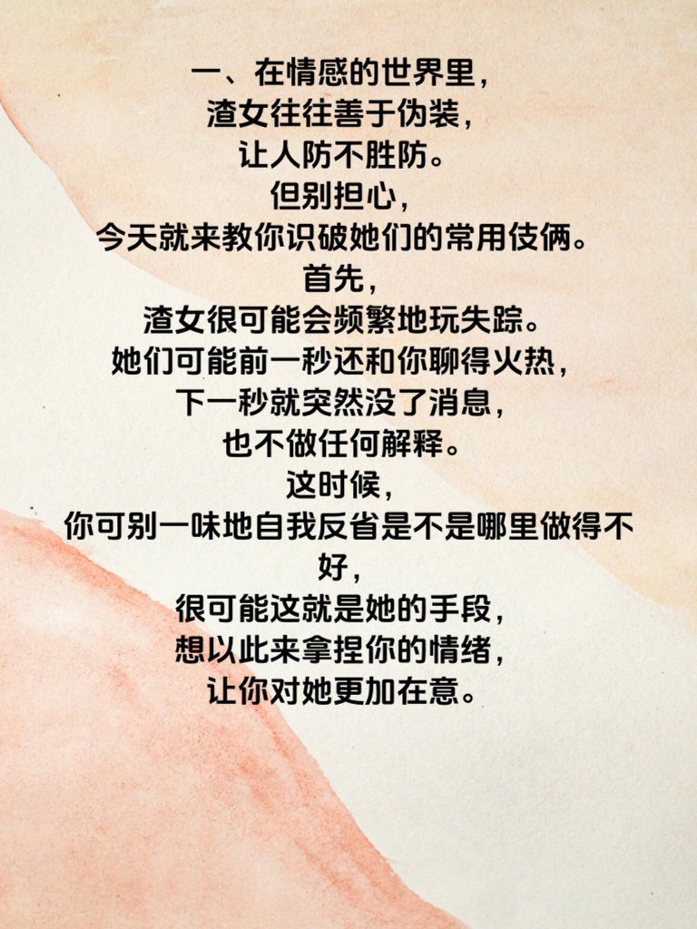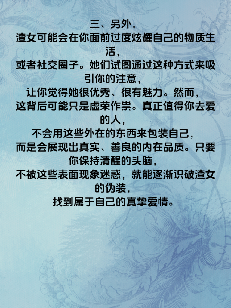 一、在情感的世界里,渣女往往善于伪装,让人防不胜防。但别担心,今天就来教你识破她们的常用伎俩。首先,渣女很可能会频繁地玩失踪。她们可能前一秒还和你聊得火热,下一秒就突然没了消息,也不做任何解释。这时候,你可别一味地自我反省是不是哪里做得不好,很可能这就是她的手段,想以此来拿捏你的情绪,让你对她更加在意。 二、还有一种常见的情况,渣女会同时和多个男生保持暧昧关系。她会和你说一些暧昧不清的话,给你一些模糊的信号,让你误以为自己有机会。但其实她对其他人也同样如此,享受着被众人追捧的感觉,却不会真正付出真心。当你发现她和别人也有类似的互动时,就要小心了。 三、另外,渣女可能会在你面前过度炫耀自己的物质生活或者社交圈子。她们试图通过这种方式来吸引你的注意,让你觉得她很优秀、很有魅力。然而,这背后可能只是虚荣作祟。真正值得你去爱的人,不会用这些外在的东西来包装自己,而是会展现出真实、善良的内在品质。只要你保持清醒的头脑,不被这些表面现象迷惑,就能逐渐识破渣女的伪装,找到属于自己的真挚爱情。