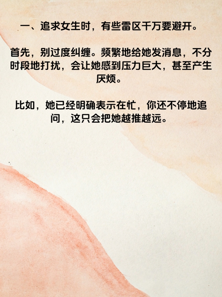 一、追求女生时,有些雷区千万要避开。首先,别过度纠缠。频繁地给她发消息,不分时段地打扰,会让她感到压力巨大,甚至产生厌烦。比如,她已经明确表示在忙,你还不停地追问,这只会把她越推越远。 二、尊重她的个人空间也很关键。每个人都有自己的生活和朋友圈子,不要试图完全掌控她。若总是要求她时刻报备行踪,限制她和朋友聚会,她会觉得失去自由,对你的好感度直线下降。 三、还有,别过早暴露需求感。刚认识就迫不及待地表白或者明示自己的追求意图,会让女生觉得你目的性太强。不妨先以朋友的身份相处,慢慢增进了解,等感情自然升温后,再水到渠成地表达心意。避开这三个雷区,你的追求之路或许会顺畅许多,成功几率也会大大增加哦。