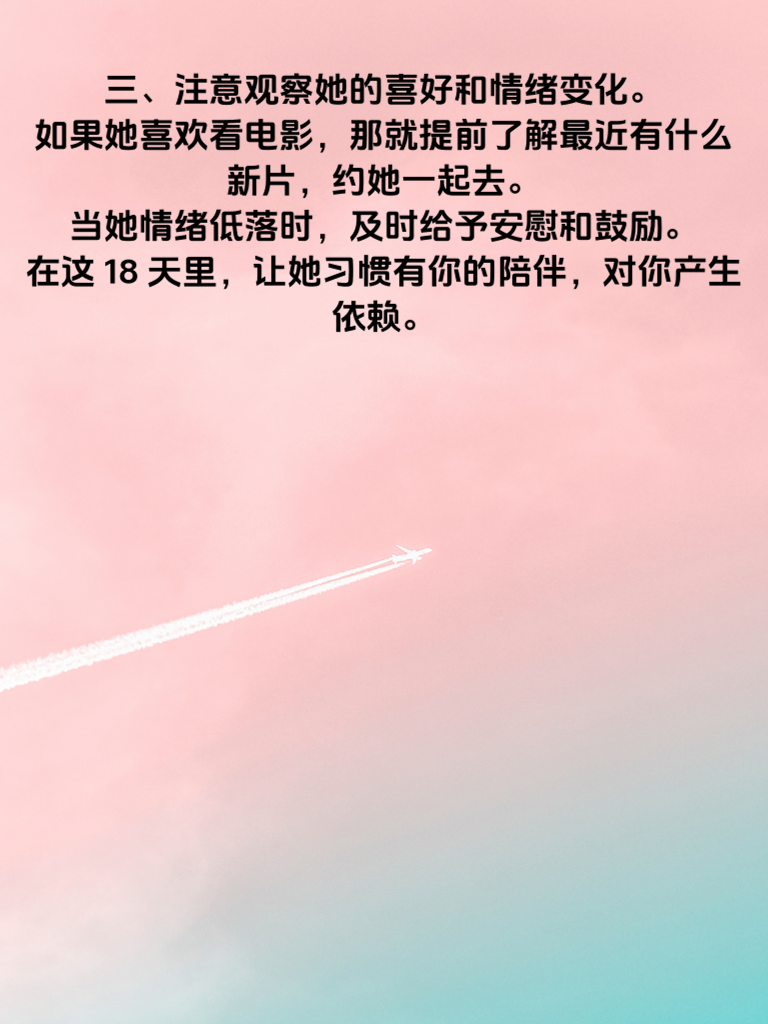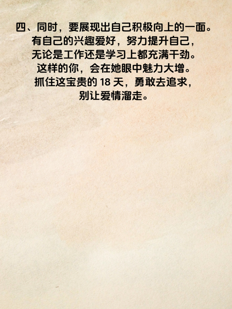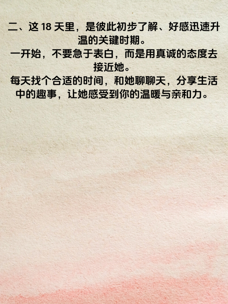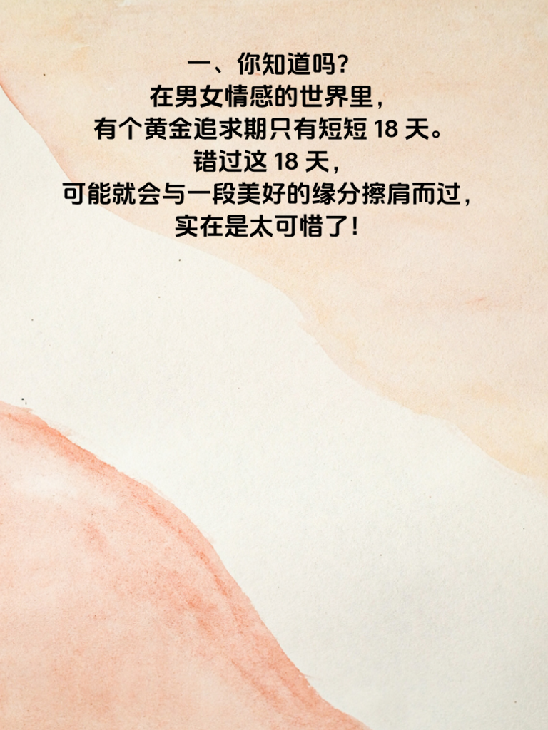 一、你知道吗?在男女情感的世界里,有个黄金追求期只有短短18天。错过这18天,可能就会与一段美好的缘分擦肩而过,实在是太可惜了! 二、这18天里,是彼此初步了解、好感迅速升温的关键时期。一开始,不要急于表白,而是用真诚的态度去接近她。每天找个合适的时间,和她聊聊天,分享生活中的趣事,让她感受到你的温暖与亲和力。 三、注意观察她的喜好和情绪变化。如果她喜欢看电影,那就提前了解最近有什么新片,约她一起去。当她情绪低落时,及时给予安慰和鼓励。在这18天里,让她习惯有你的陪伴,对你产生依赖。 四、同时,要展现出自己积极向上的一面。有自己的兴趣爱好,努力提升自己,无论是工作还是学习上都充满干劲。这样的你,会在她眼中魅力大增。抓住这宝贵的18天,勇敢去追求,别让爱情溜走。