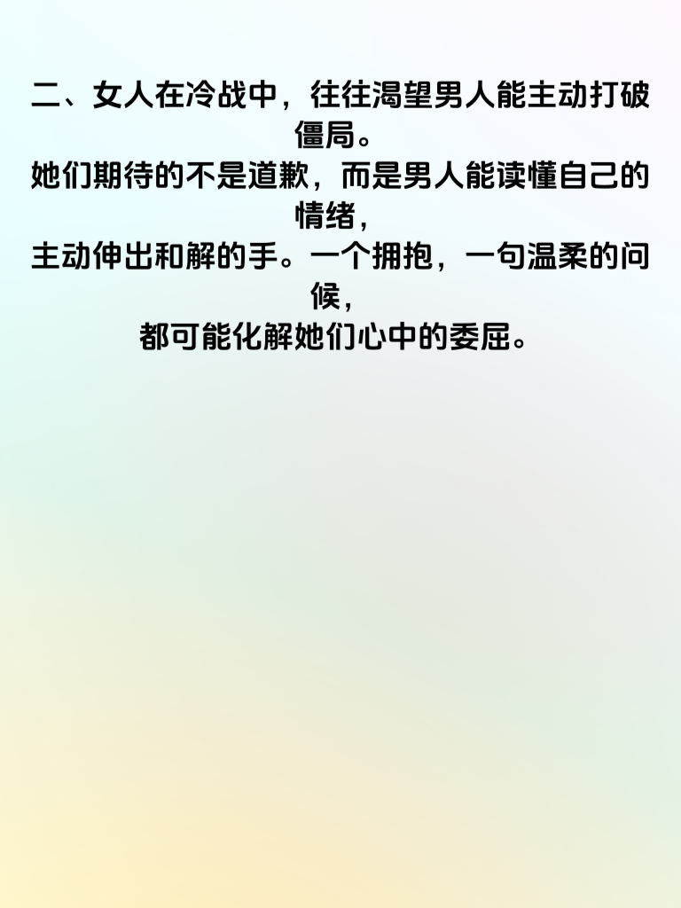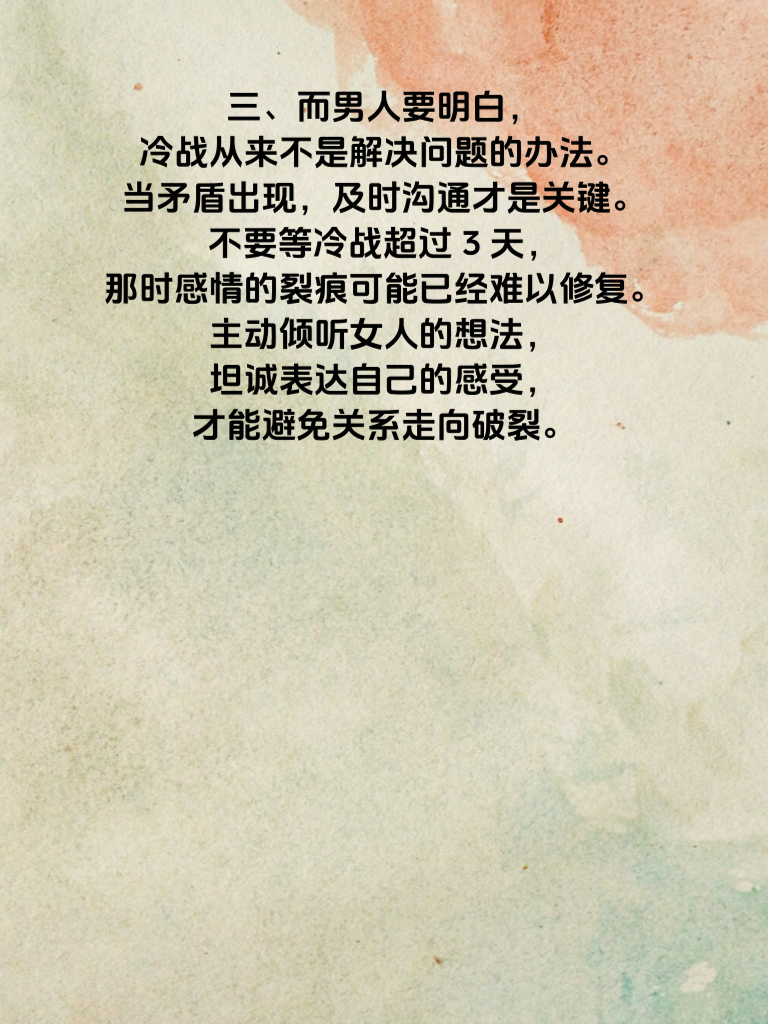 一、婚后冷战超3天,关系真的会濒临破裂。冷战,就像一场无声的暴风雨,看似平静,却在暗暗侵蚀着夫妻间的感情。每一次的沉默,每一个僵持的夜晚,都在让彼此的心渐渐疏远。 二、女人在冷战中,往往渴望男人能主动打破僵局。她们期待的不是道歉,而是男人能读懂自己的情绪,主动伸出和解的手。一个拥抱,一句温柔的问候,都可能化解她们心中的委屈。 三、而男人要明白,冷战从来不是解决问题的办法。当矛盾出现,及时沟通才是关键。不要等冷战超过3天,那时感情的裂痕可能已经难以修复。主动倾听女人的想法,坦诚表达自己的感受,才能避免关系走向破裂。 四、婚姻需要双方共同呵护。冷战超3天是危险信号,我们要学会珍惜彼此的感情,用爱和理解去化解矛盾,不让关系在沉默中濒临破裂,携手走过每一个平淡又珍贵的日子。