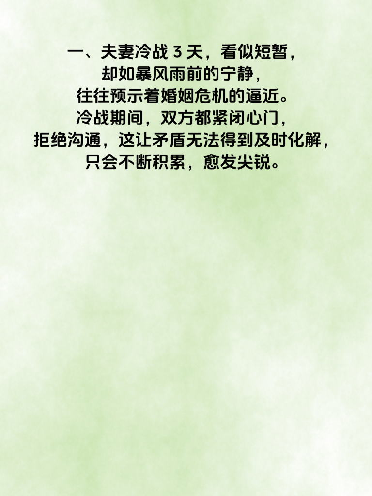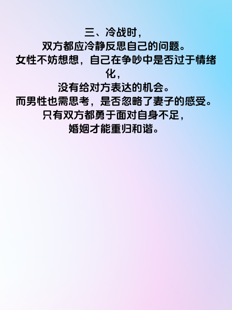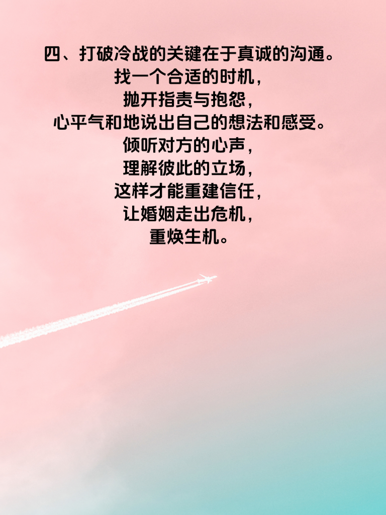 一、夫妻冷战3天,看似短暂,却如暴风雨前的宁静,往往预示着婚姻危机的逼近。冷战期间,双方都紧闭心门,拒绝沟通,这让矛盾无法得到及时化解,只会不断积累,愈发尖锐。 二、女性在冷战中,常常渴望男方能主动打破僵局。她们或许不会直接表达内心的想法,但会通过一些细微的举动来暗示。比如,整理两人共同的物品,或是在男方面前表现出若有所思的神情。这时,男方若能敏锐察觉,主动迈出和解的第一步,或许就能避免危机的升级。 三、冷战时,双方都应冷静反思自己的问题。女性不妨想想,自己在争吵中是否过于情绪化,没有给对方表达的机会。而男性也需思考,是否忽略了妻子的感受。只有双方都勇于面对自身不足,婚姻才能重归和谐。 四、打破冷战的关键在于真诚的沟通。找一个合适的时机,抛开指责与抱怨,心平气和地说出自己的想法和感受。倾听对方的心声,理解彼此的立场,这样才能重建信任,让婚姻走出危机,重焕生机。
