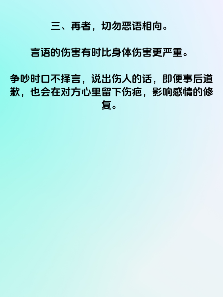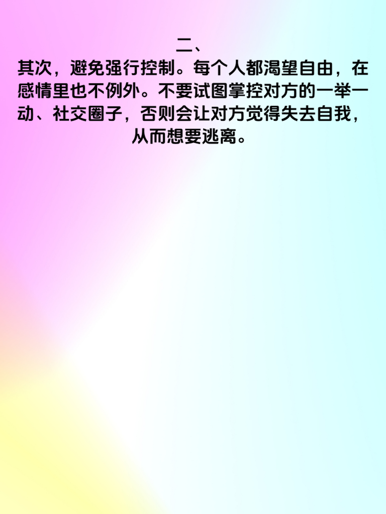 一、男女交往中,有几个忌讳千万不能碰。首先,不要过度猜疑。信任是感情的基石,无端怀疑对方只会让关系充满裂痕。比如,看到对方和异性有正常交流,就醋意大发,不断质问,这会让对方感到压抑和疲惫。 二、其次,避免强行控制。每个人都渴望自由,在感情里也不例外。不要试图掌控对方的一举一动、社交圈子,否则会让对方觉得失去自我,从而想要逃离。 三、再者,切勿恶语相向。言语的伤害有时比身体伤害更严重。争吵时口不择言,说出伤人的话,即便事后道歉,也会在对方心里留下伤疤,影响感情的修复。 四、另外,不要总是冷战。冷战看似能让自己冷静,实则会让问题积压,让感情变得冷漠。遇到矛盾及时沟通,坦诚表达自己的想法和感受,才能让感情越来越好。 五、最后,别忽略对方付出。要懂得感恩,珍惜对方为这段感情做的努力,适时给予回应和肯定,这样感情才会在良性互动中升温。