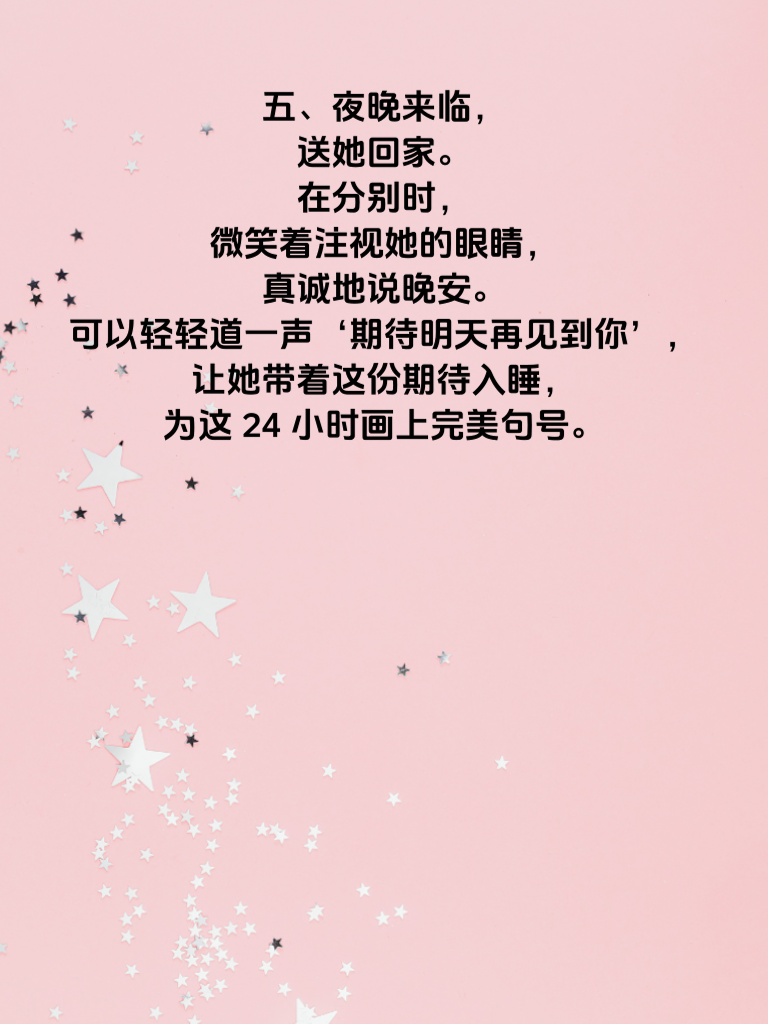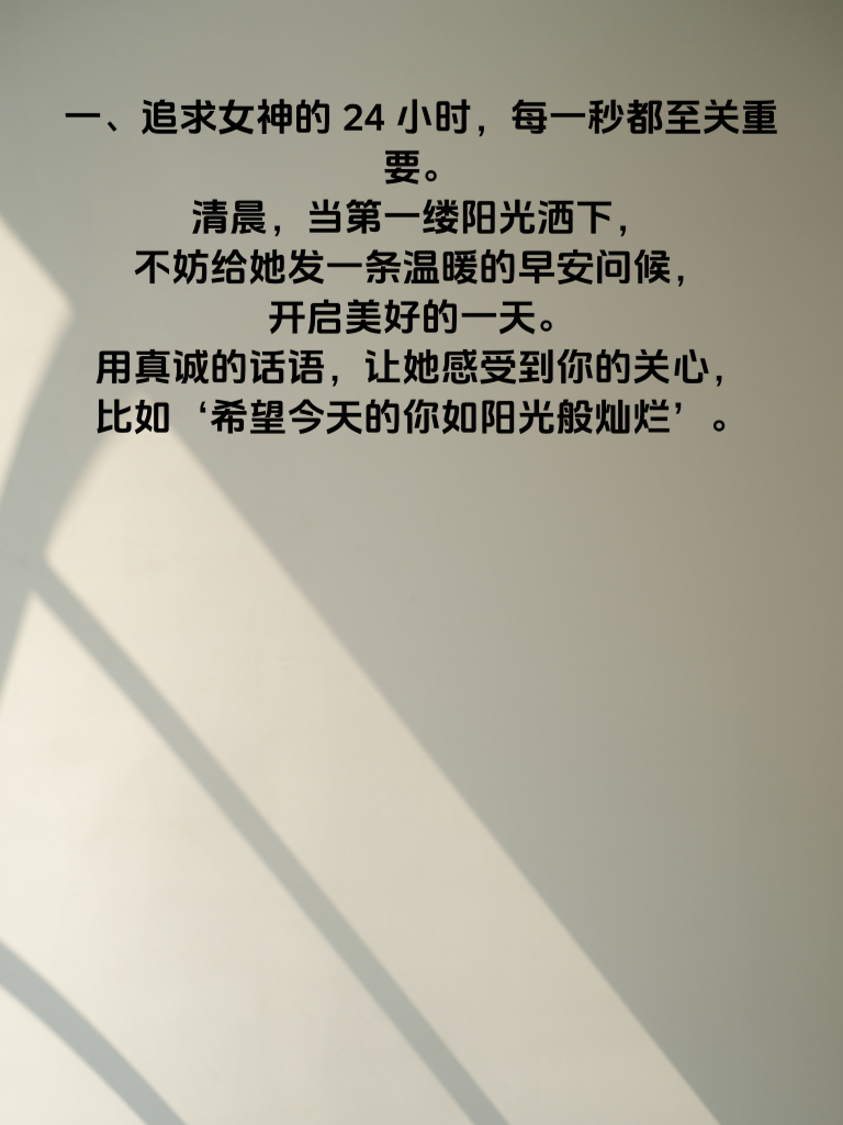 一、追求女神的24小时,每一秒都至关重要。清晨,当第一缕阳光洒下,不妨给她发一条温暖的早安问候,开启美好的一天。用真诚的话语,让她感受到你的关心,比如‘希望今天的你如阳光般灿烂’。 二、白天,抓住每一个能展现自己魅力的机会。如果有共同朋友聚会,积极参与,展示你的风趣幽默和绅士风度。适时地为她递上一杯饮料,不经意间的小举动,能让她对你好感倍增。 三、聊天时,专注倾听她的想法,不要急于表达自己。用眼神给予她关注,适时点头表示认同。分享一些有趣的经历,但不要过于自我吹嘘,让交流自然而愉快。 四、傍晚时分,约她一起散步。聊聊生活、梦想,感受彼此的气息。此时,微风轻拂,气氛浪漫,真诚地表达你对她的欣赏,比如‘和你在一起,我发现了生活更多的美好’。 五、夜晚来临,送她回家。在分别时,微笑着注视她的眼睛,真诚地说晚安。可以轻轻道一声‘期待明天再见到你’,让她带着这份期待入睡,为这24小时画上完美句号。