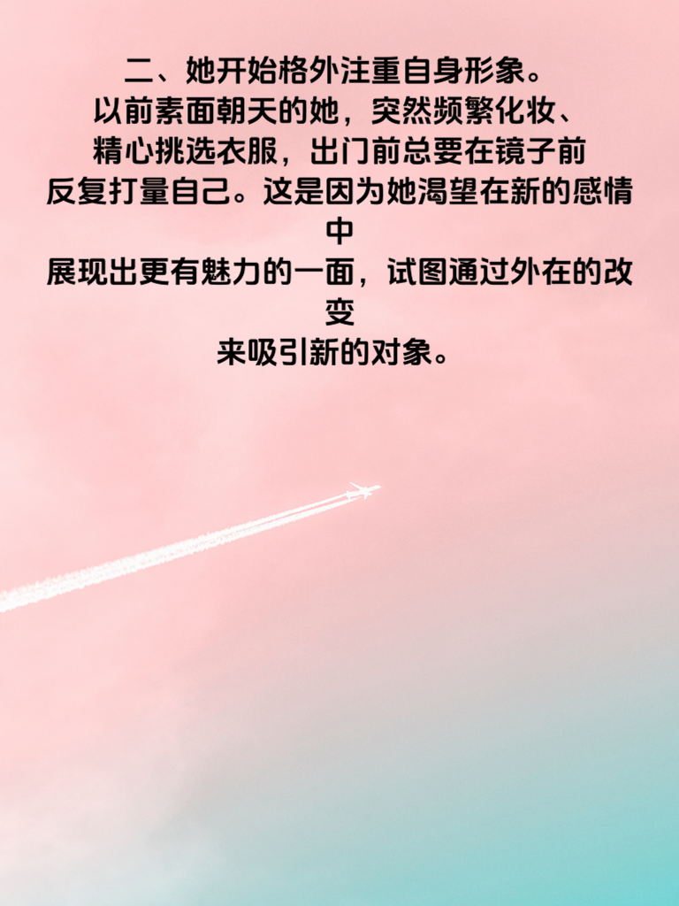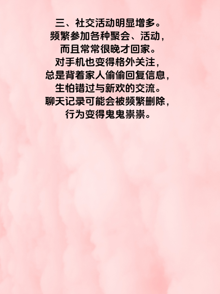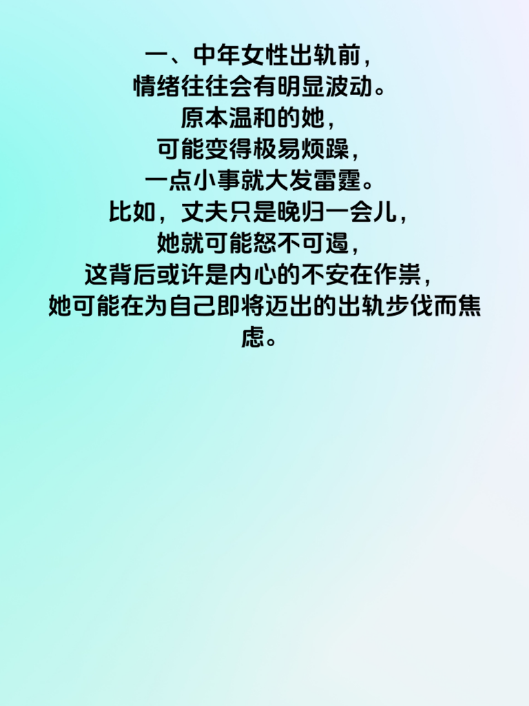 一、中年女性出轨前,情绪往往会有明显波动。原本温和的她,可能变得极易烦躁,一点小事就大发雷霆。比如,丈夫只是晚归一会儿,她就可能怒不可遏,这背后或许是内心的不安在作祟,她可能在为自己即将迈出的出轨步伐而焦虑。 二、她开始格外注重自身形象。以前素面朝天的她,突然频繁化妆、精心挑选衣服,出门前总要在镜子前反复打量自己。这是因为她渴望在新的感情中展现出更有魅力的一面,试图通过外在的改变来吸引新的对象。 三、社交活动明显增多。频繁参加各种聚会、活动,而且常常很晚才回家。对手机也变得格外关注,总是背着家人偷偷回复信息,生怕错过与新欢的交流。聊天记录可能会被频繁删除,行为变得鬼鬼祟祟。 四、对丈夫的态度发生转变。不再像从前那样关心体贴,甚至开始挑剔、嫌弃。以前会为丈夫准备温馨的晚餐,现在却常常敷衍了事。夫妻间的亲密接触也大幅减少,她的心已经渐渐偏向了他人。