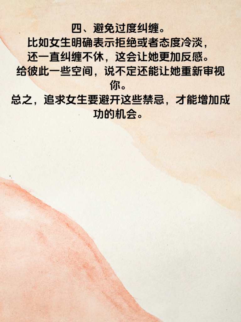 一、追求女生时,切忌过于急切。很多男生一上来就猛轰滥炸般表达爱意,这会给女生带来巨大压力。感情需要慢慢培养,急于求成往往适得其反。比如,刚认识就天天表白,女生可能会觉得你不够稳重,从而对你产生抵触。 二、不要总是自我吹嘘。有些男生为了吸引女生,会夸大自己的能力、成就等。可一旦被识破,女生就会觉得你虚伪。真诚才是长久之道,展示真实的自己,偶尔的小成就自然流露,反而更能赢得好感。 三、切勿忽视女生的感受。追求过程中,要时刻关注她的想法和情绪。如果她对某个话题不感兴趣,就别一直追问。尊重她的意见,让她感受到你对她的在乎,感情才能顺利发展。 四、避免过度纠缠。比如女生明确表示拒绝或者态度冷淡,还一直纠缠不休,这会让她更加反感。给彼此一些空间,说不定还能让她重新审视你。总之,追求女生要避开这些禁忌,才能增加成功的机会。