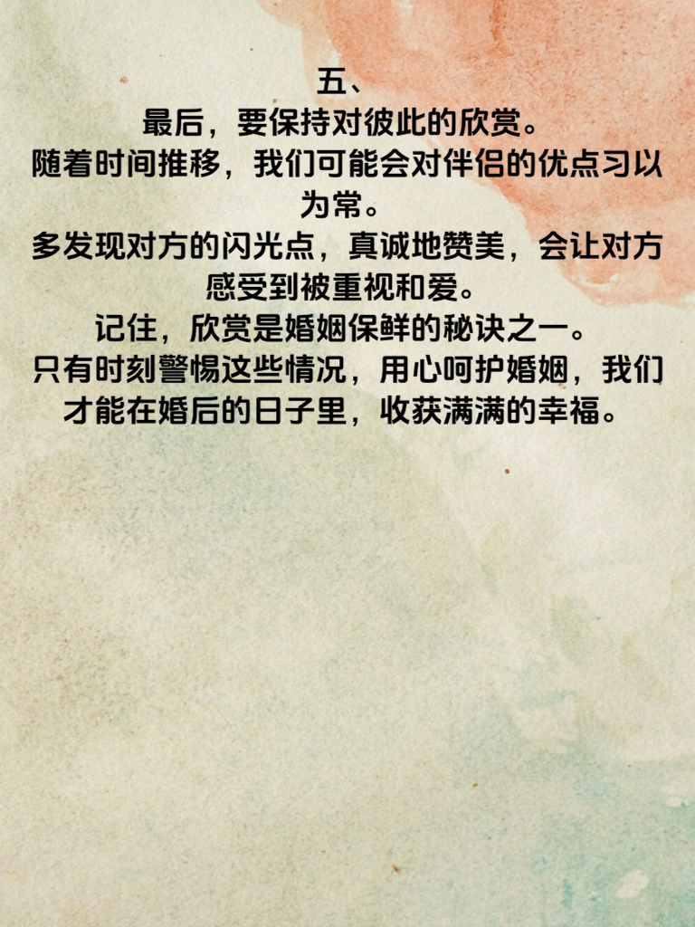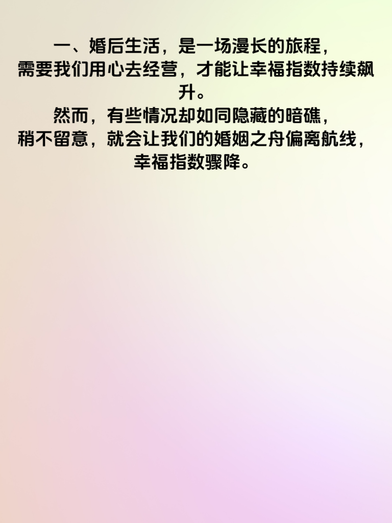 一、婚后生活,是一场漫长的旅程,需要我们用心去经营,才能让幸福指数持续飙升。然而,有些情况却如同隐藏的暗礁,稍不留意,就会让我们的婚姻之舟偏离航线,幸福指数骤降。 二、首先,要谨防忽视对方的感受。婚后,生活琐事增多,我们可能会渐渐忘记关注伴侣内心的需求。一句贴心的问候,一个温暖的拥抱,看似微不足道,却能在对方心中泛起爱的涟漪。不要等到对方失望累积,才惊觉自己的疏忽。 三、其次,避免无休止的争吵。争吵是婚姻中的常态,但如果任由情绪失控,恶语相向,只会让感情在一次次争吵中消磨殆尽。学会控制情绪,冷静沟通,站在对方的角度思考问题,才能化解矛盾,让婚姻重归和谐。 四、再者,别让工作占据全部生活。婚后,事业或许依然重要,但家才是心灵的港湾。不要因为忙碌的工作,而忽略了与伴侣共度的时光。偶尔放下手中的事务,一起看场电影,共进晚餐,为平淡的生活增添浪漫色彩。 五、最后,要保持对彼此的欣赏。随着时间推移,我们可能会对伴侣的优点习以为常。多发现对方的闪光点,真诚地赞美,会让对方感受到被重视和爱。记住,欣赏是婚姻保鲜的秘诀之一。只有时刻警惕这些情况,用心呵护婚姻,我们才能在婚后的日子里,收获满满的幸福。