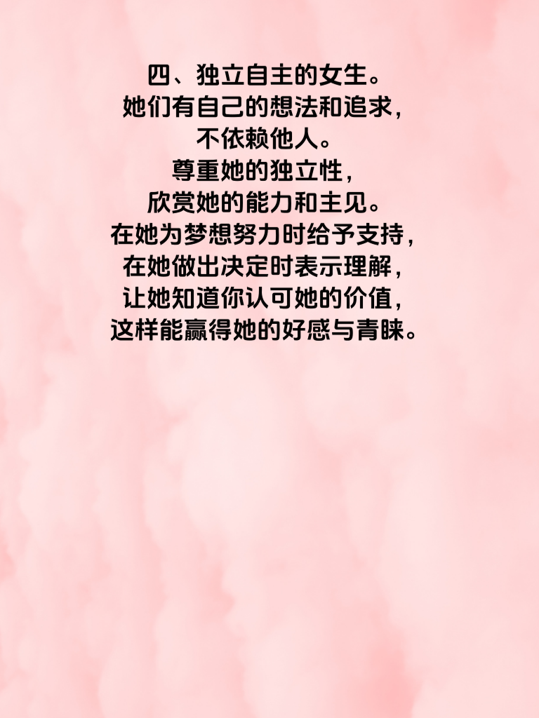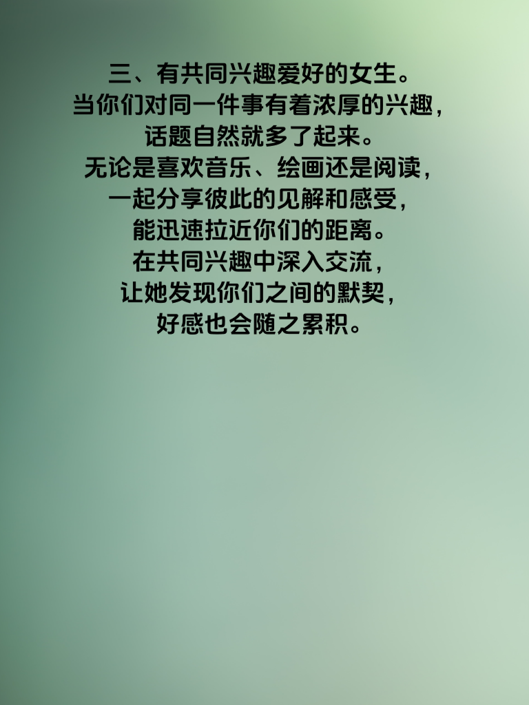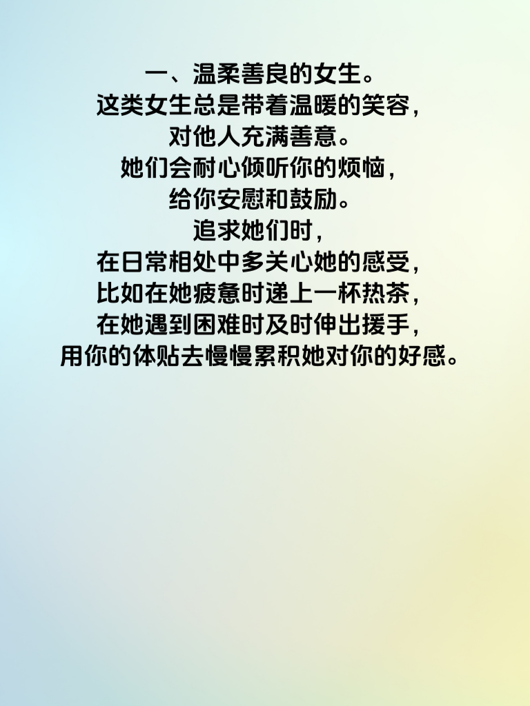一、温柔善良的女生。这类女生总是带着温暖的笑容,对他人充满善意。她们会耐心倾听你的烦恼,给你安慰和鼓励。追求她们时,在日常相处中多关心她的感受,比如在她疲惫时递上一杯热茶,在她遇到困难时及时伸出援手,用你的体贴去慢慢累积她对你的好感。 二、积极向上的女生。她们充满活力,对生活有着热情。和她们在一起,你能感受到满满的正能量。你可以和她一起参与各种有趣的活动,如运动、看展览等,展现出你积极的一面,与她共同追求生活中的美好,让她看到你们有相似的生活态度,从而增加她对你的好感。 三、有共同兴趣爱好的女生。当你们对同一件事有着浓厚的兴趣,话题自然就多了起来。无论是喜欢音乐、绘画还是阅读,一起分享彼此的见解和感受,能迅速拉近你们的距离。在共同兴趣中深入交流,让她发现你们之间的默契,好感也会随之累积。 四、独立自主的女生。她们有自己的想法和追求,不依赖他人。尊重她的独立性,欣赏她的能力和主见。在她为梦想努力时给予支持,在她做出决定时表示理解,让她知道你认可她的价值,这样能赢得她的好感与青睐。