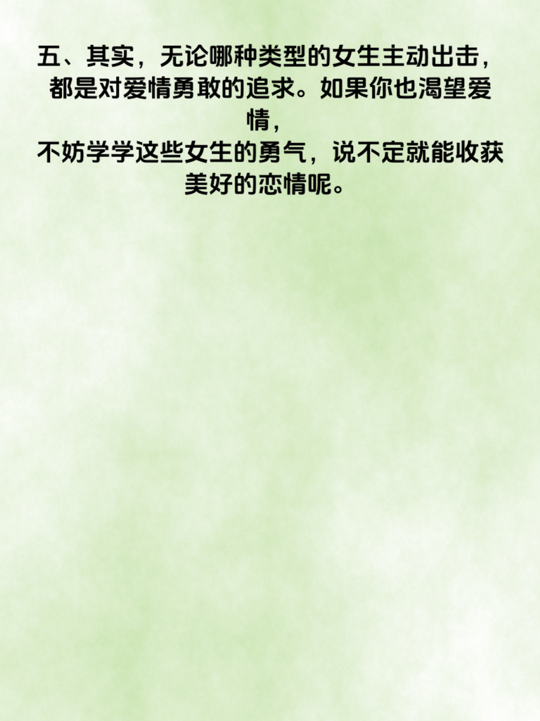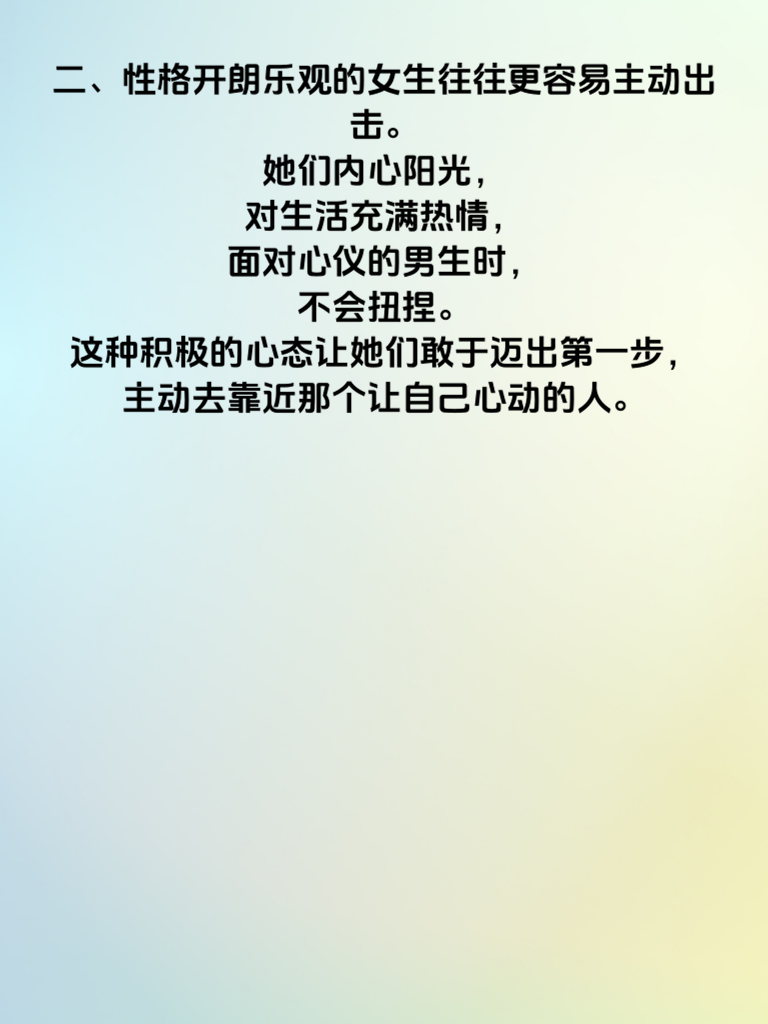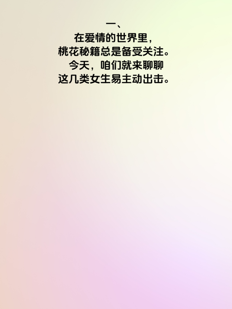 一、在爱情的世界里,桃花秘籍总是备受关注。今天,咱们就来聊聊这几类女生易主动出击。 二、性格开朗乐观的女生往往更容易主动出击。她们内心阳光,对生活充满热情,面对心仪的男生时,不会扭捏。这种积极的心态让她们敢于迈出第一步,主动去靠近那个让自己心动的人。 三、经历丰富的女生也常有主动出击的表现。她们见过了世间百态,明白机会难得。一旦遇到那个特别的他,就会果断出手,不轻易错过可能的美好爱情。 四、还有一类自信独立的女生。她们深知自己的魅力,相信自己能把握感情。所以当爱情出现时,她们会主动出击,去争取属于自己的幸福,不会依赖他人的主动,而是靠自己去创造爱情的可能。 五、其实,无论哪种类型的女生主动出击,都是对爱情勇敢的追求。如果你也渴望爱情,不妨学学这些女生的勇气,说不定就能收获美好的恋情呢。