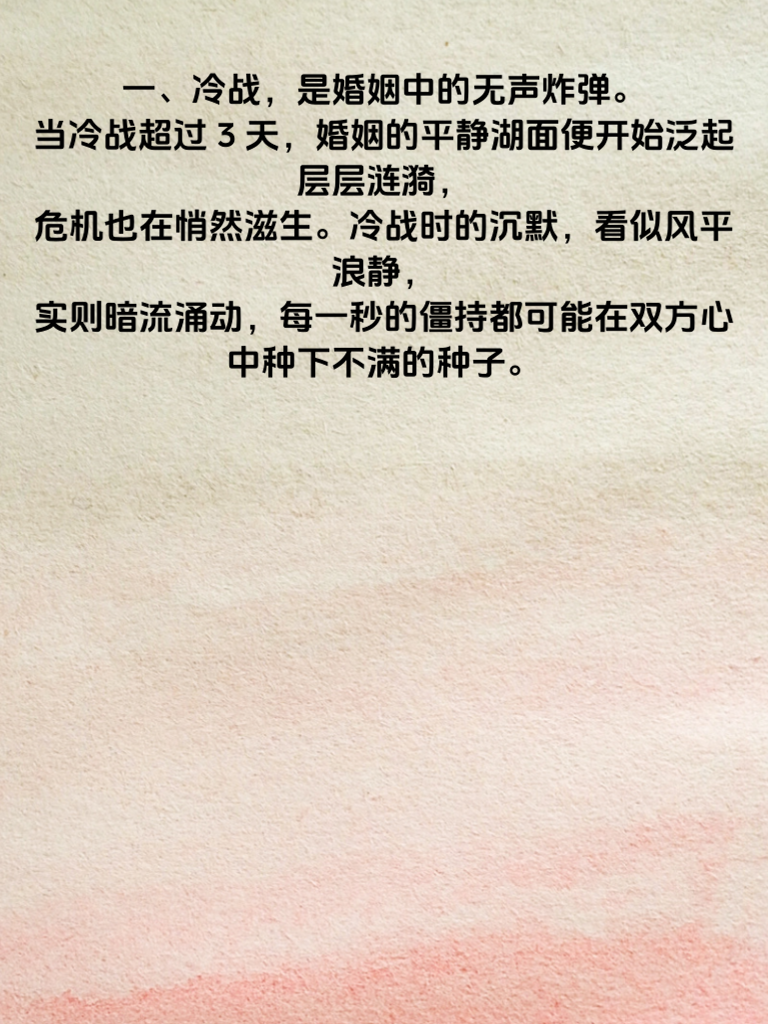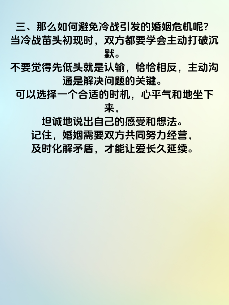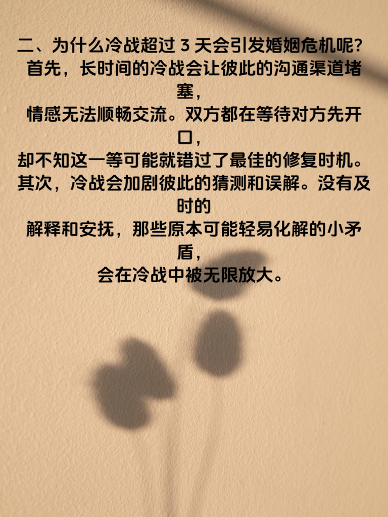 一、冷战,是婚姻中的无声炸弹。当冷战超过3天,婚姻的平静湖面便开始泛起层层涟漪,危机也在悄然滋生。冷战时的沉默,看似风平浪静,实则暗流涌动,每一秒的僵持都可能在双方心中种下不满的种子。 二、为什么冷战超过3天会引发婚姻危机呢?首先,长时间的冷战会让彼此的沟通渠道堵塞,情感无法顺畅交流。双方都在等待对方先开口,却不知这一等可能就错过了最佳的修复时机。其次,冷战会加剧彼此的猜测和误解。没有及时的解释和安抚,那些原本可能轻易化解的小矛盾,会在冷战中被无限放大。 三、那么如何避免冷战引发的婚姻危机呢?当冷战苗头初现时,双方都要学会主动打破沉默。不要觉得先低头就是认输,恰恰相反,主动沟通是解决问题的关键。可以选择一个合适的时机,心平气和地坐下来,坦诚地说出自己的感受和想法。记住,婚姻需要双方共同努力经营,及时化解矛盾,才能让爱长久延续。