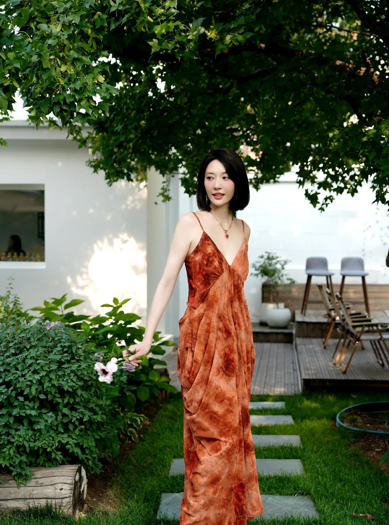暖棕吊带裙,在花园里美得刚刚好。捧杯特调,静享绣球花旁的慵懒;漫步石板小径,任花