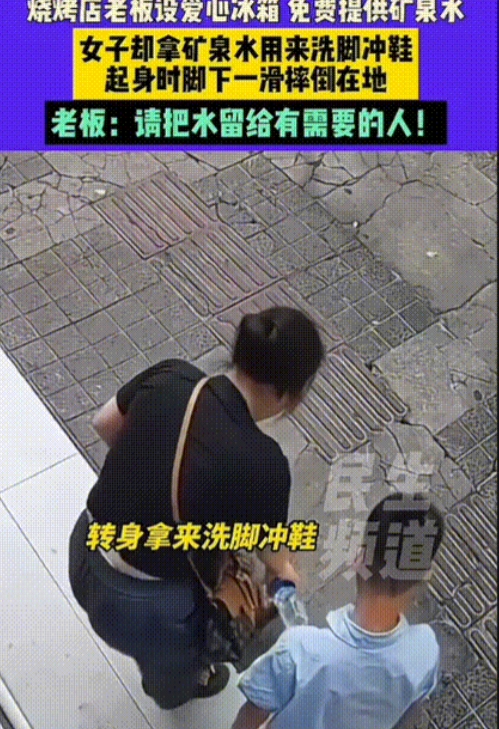 举头三尺有神明!湖南,烧烤店老板在门口设立了爱心冰箱并且免费提供矿泉水,一女子看见后随手拿了瓶水,令人气愤的是她竟然用水冲脚洗鞋!结果一个转身就摔趴在地上。