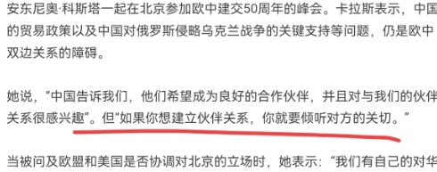 卡拉斯表示,中国告诉我们,他们希望成为良好的合作伙伴,并且对与我们的伙伴关系很感兴趣。但如果你想建立伙伴关系,你就要倾听对方的关切。很显然,虽然这一次访华,卡拉斯的表态语气没有那么强硬,但是在经贸问题和俄乌问题上,卡拉斯要我们改变立场的意图还是非常明显的。