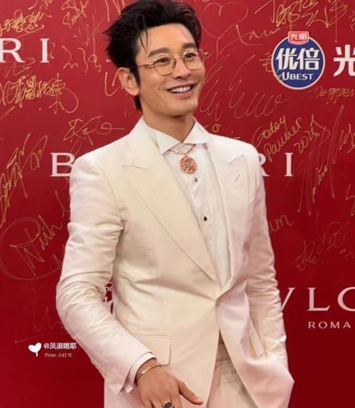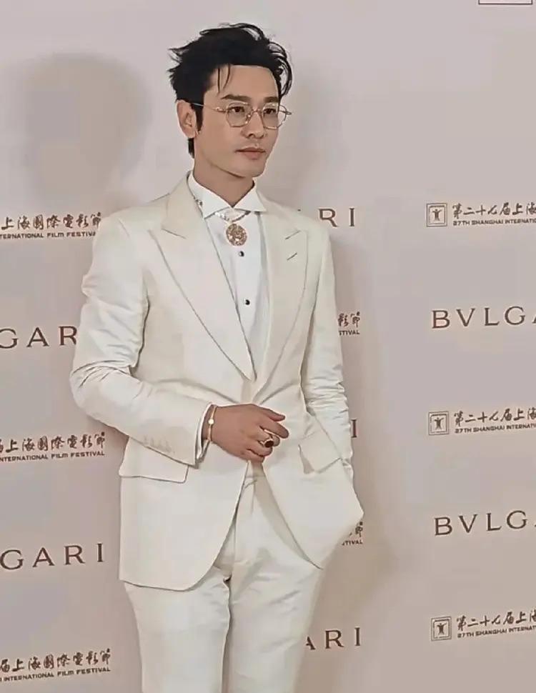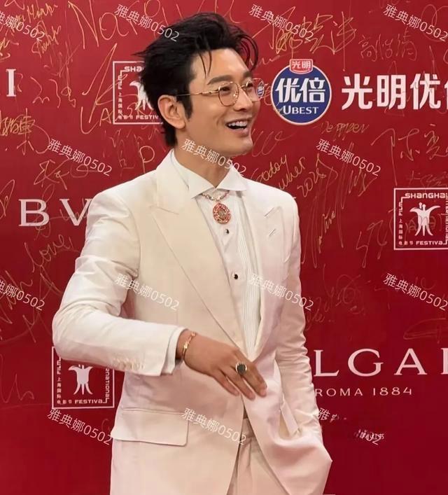 黄晓明上海电影节闭幕红毯造型,首饰挂满全身,项链叠戴,戒指手镯齐上阵,还戴个金丝