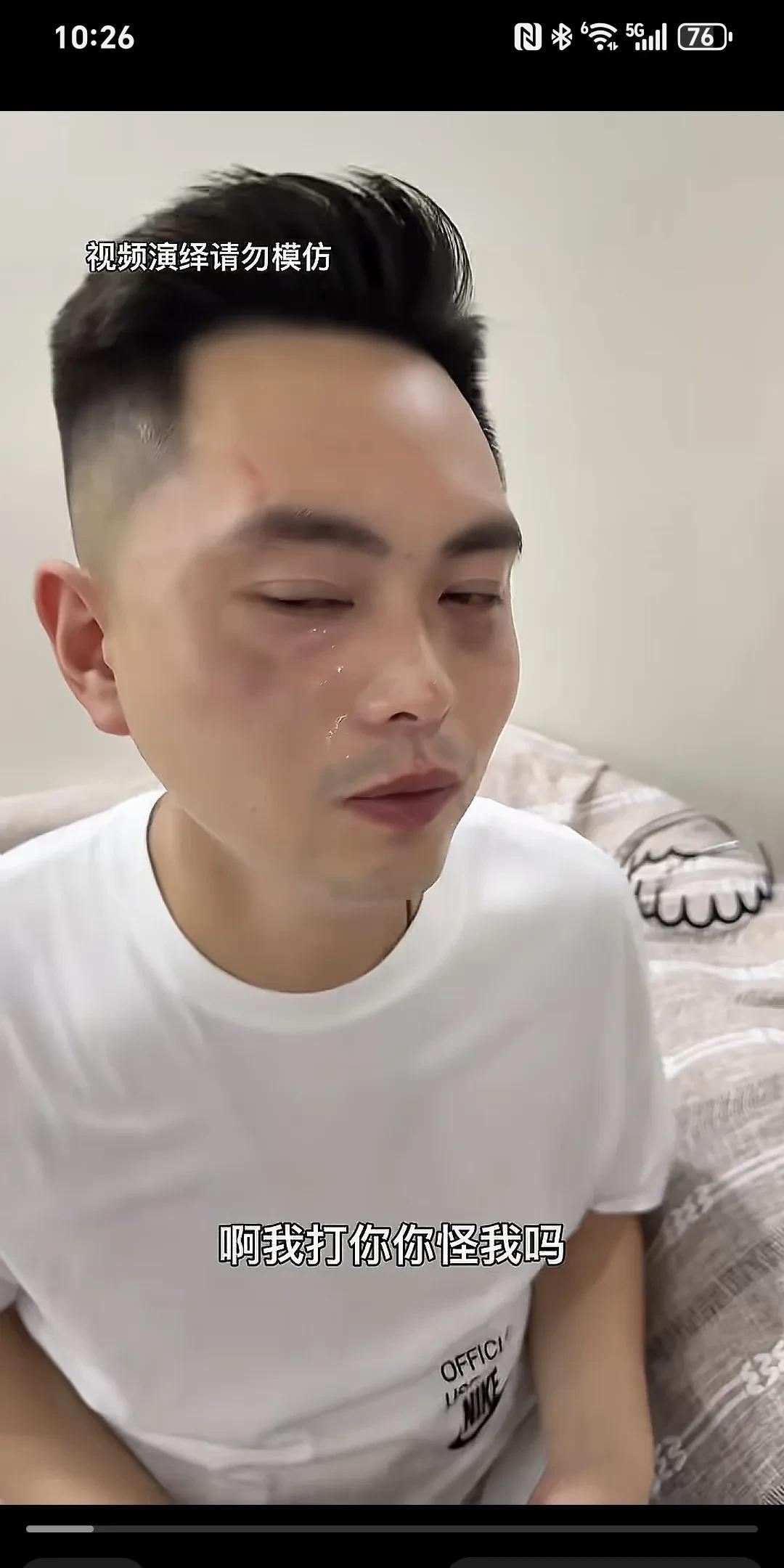 老婆一边拍打着正在哭泣的老公的脸,一边训斥道:“你挨的打哪有一顿是白挨的?啊,我
