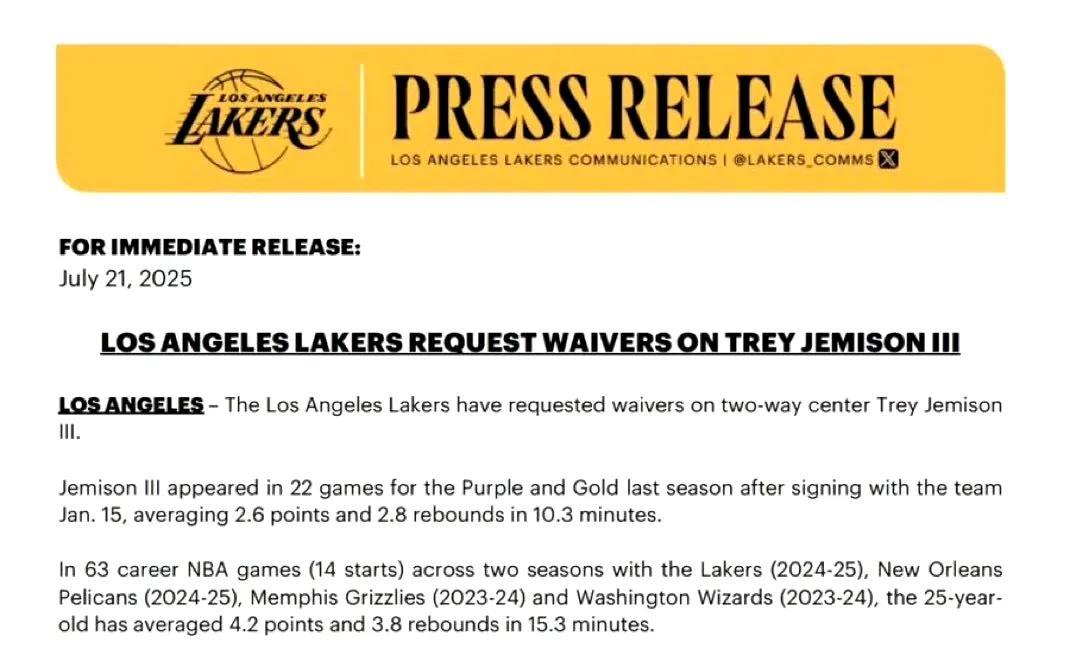 湖人官方正式宣布,裁掉双向合同中锋特雷·杰米森三世。自今年1月15日加盟湖人以来