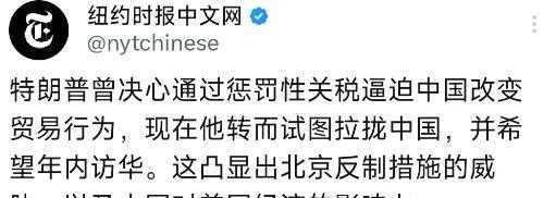 纽约时报中文网7月21日写道:“特朗普曾决心通过惩罚性关税逼迫中国改变贸易行为,现在他转而试图拉拢中国,并希望年内访华。这凸显出北京反制措施的威胁,以及中国对美国经济的影响力。” 特朗普这几年对中国的态度,简直像坐过山车。前几年还抡着关税大棒猛砸,恨不得把中美贸易搅个天翻地覆。 现在倒好,转头就想拉着中国谈,还盼着年内能访华。这前后一百八十度的大转弯,明眼人都看得出来,不是他突然转性了,是中国的反制手段实在够硬,美国经济离了中国是真不行。 当初特朗普搞惩罚性关税,本想逼着中国在贸易上让步。他大概觉得,美国市场大,中国离不开。可他算错了一点,中国手里的牌,比他想象的多得多。 中国是美国农产品的大买家,大豆、玉米这些,每年从美国进口的量能堆成山。他一加关税,中国反手就去巴西、阿根廷下订单。 美国农场主手里的大豆堆成了小山,价格跌得底裤都快没了。那些靠种庄稼吃饭的美国农民,急得天天往白宫打电话,差点没把特朗普的办公室打爆。 不光是农产品,制造业这块更让美国头疼。中国是全球供应链的核心,从手机零件到汽车配件,多少美国企业的生产线都得靠中国供货。 特朗普搞贸易壁垒,美国企业的成本噌噌往上涨。苹果手机在中国卖不动了,因为关税加得太多,价格高得吓人。 特斯拉在上海的工厂赚得盆满钵满,可美国本土的工厂却因为零件短缺,停产了好几次。这些企业老板们联名给国会写信,把特朗普骂得狗血淋头。他们心里门儿清,离了中国市场,自家的财报就得变绿,股价就得跳水。 美国经济这些年本就磕磕绊绊。通胀像野草一样疯长,老百姓过日子越来越紧巴。美联储加息加得手都软了,可物价还是压不住。这时候他们才发现,中国生产的日用品,从衣服到小家电,在美国超市里占了半壁江山。 要是真跟中国闹僵了,这些东西的价格还得往上飙。到时候老百姓的怨气,能把特朗普的竞选口号冲得稀碎。他心里比谁都清楚,明年就要大选了,经济搞不好,选票根本没戏。 中国手里的美债,也是个让美国睡不着觉的玩意儿。这些年中国持有的美债规模,虽然起起落落,但始终是美国国债的重要买家。 要是中国哪天不高兴了,大手一挥减持,美国国债的价格就得波动,利率就得往上走。到时候美国政府借钱的成本更高,本就债台高筑的财政,怕是要直接崩掉。特朗普再横,也不敢拿国家的钱袋子开玩笑。 还有稀土这张牌,更是美国的软肋。芯片、导弹这些高科技产品,离了稀土根本造不出来。中国是全球稀土加工的老大,几乎垄断了整个产业链。特朗普想在高科技领域卡中国脖子,中国要是把稀土出口一收紧,美国的军工企业就得停工,硅谷的那些科技巨头也得傻眼。高通的芯片造不出来,洛克希德·马丁的导弹生产线得停摆。这些美国的“心头肉”,哪个也经不起这么折腾。 美国经济现在的状况,说是内忧外患一点不为过。银行接连爆雷,股市忽高忽低,老百姓兜里的钱越来越不经花。这时候特朗普要是还跟中国对着干,无异于自寻死路。他想访华,说白了就是想从中国这儿讨点好处。比如让中国多买点美国的东西,帮美国企业缓解一下压力,顺便在大选前搞点政绩出来,好让选民看看,他还是有本事的。