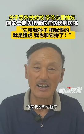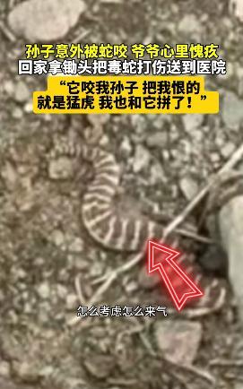 “拼上老命了!”7月15日,黑龙江,孙子到山脚下的爷爷家玩,结果被毒蛇咬伤,爷爷感到很愧疚,于是就打车回家,拿锄头把毒蛇打晕,送到医院给医生看,希望能提供帮助!爷爷坦言:“虽然自己也很怕蛇,但它咬我孙子,把我恨的,就是猛虎,也和它拼了!” 如今,孩子们都放暑假了,不少家长因为没空看管,就将其送回老家交给老人照顾,老人们自然开心得很,对孙子孙女呵护有加,生怕受一点点伤。然而在牡丹江市,意外还是发生了。 当天,爷爷在家里照顾6岁的小孙子,过了一会儿,他去院子里插豆角架,不料就是这个间隙,宝贝孙子被毒蛇给咬了。 奶奶回家后,看到孙子在一旁哭,脸上和手上还有血,急忙问老伴发生了什么事?爷爷仔细一看,发现孙子的手上有伤口,整条手臂也开始逐渐变黑。 意识到是被毒蛇咬了,老两口急忙将孩子送往医院,爷爷心里十分内疚,都怪自己没注意,这才害苦了孙子,他虽然也怕蛇,但此刻已经下定决心要为孙子报仇! 第二天一大早,爷爷就打车回了家,在院子里仔细搜寻起来,最终发现了一条毒蛇,二话不说举起锄头将其打晕,随后装进桶里带回了医院,希望能为小孙子的治疗提供帮助。 所幸孩子送医及时,不仅脱离了生命危险,而且还保住了胳膊! 如今,孩子已经苏醒过来,相信用不了多长时间就能出院,只是这回家长要多留个心眼了,不能再让危险找上门来。 大家对于这件事是怎么看的? 信息来源:《7月19日(发布),黑龙江牡丹江。孙子意外被蛇咬 爷爷心里愧疚。回家拿锄头把毒蛇打伤送到医院。“它咬我孙子 把我恨的 就是猛虎 我也和它拼了!”》新闻夜航