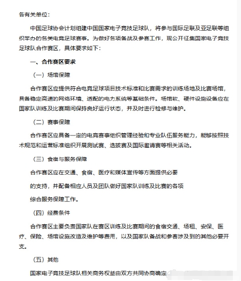 为做好各项备战及参赛工作,目前公开征集国家电子竞技足球队合作赛区,合作赛区应具备一定的电竞赛事组织管理经验和专业队伍服务能力,能够按照技术规范和运营标准组织开展测试赛、选拔赛及国际邀请赛等相关活动。