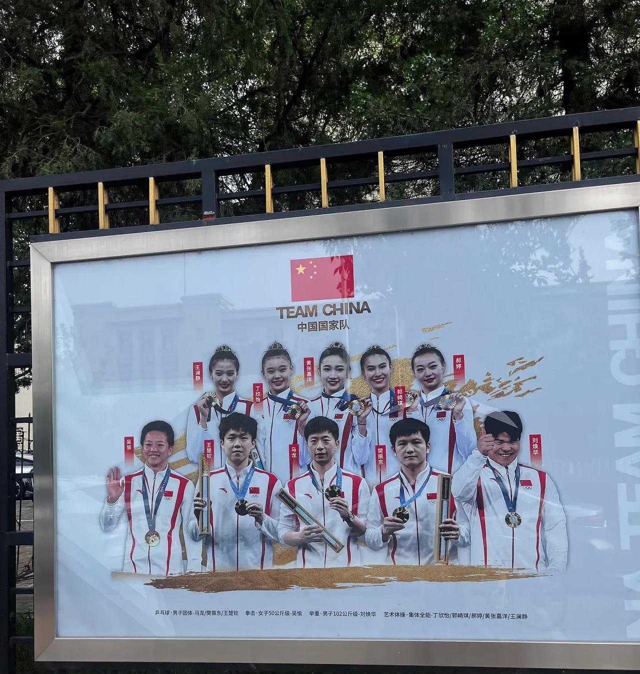 位于北京的国家体育总局训练局公寓外墙最近进行加固改造工程,将墙体全部铺上国家队运动员、奥运冠军的宣传海报。 来看下粉丝们拍摄的海报中的乒乓球元素,包含巴黎奥运会中国乒乓球队男女团各三人组。 看出来这位拍摄者是一位喜欢孙颖莎和王曼昱的乒乓球迷了!