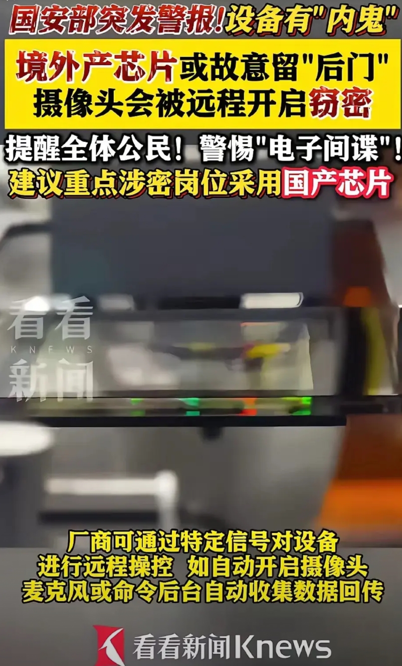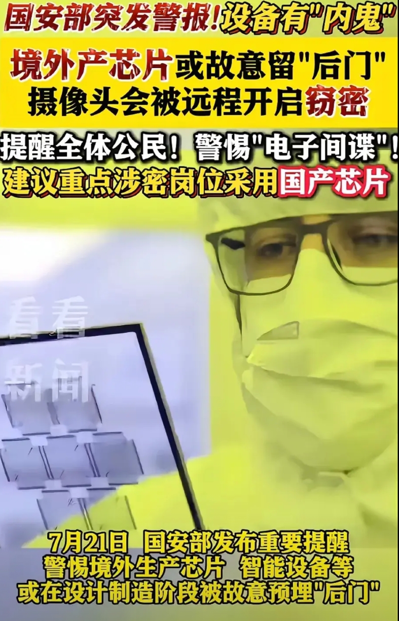 国安部发布重要提醒,我们所用的电子设备有可能被远程控制。 既然是国安部的通告,肯定有了这种情况才发布提醒的。电子设备境外产芯片留有后门早不是什么新鲜事了。本来中国和西方安全领域博弈日趋激烈,这个时候用国产电子产品不仅是爱国,也是为自己的财产安全考虑。 可有些人偏偏不这样认为,该买的国外产手机电脑依然去追着买,他们以此为耀。真的可笑,不知这个时候哪来的耀?因为自己还没有血的教训,那些人是不见棺材不落泪的!所谓人各有志吧!还能怎样说呢。