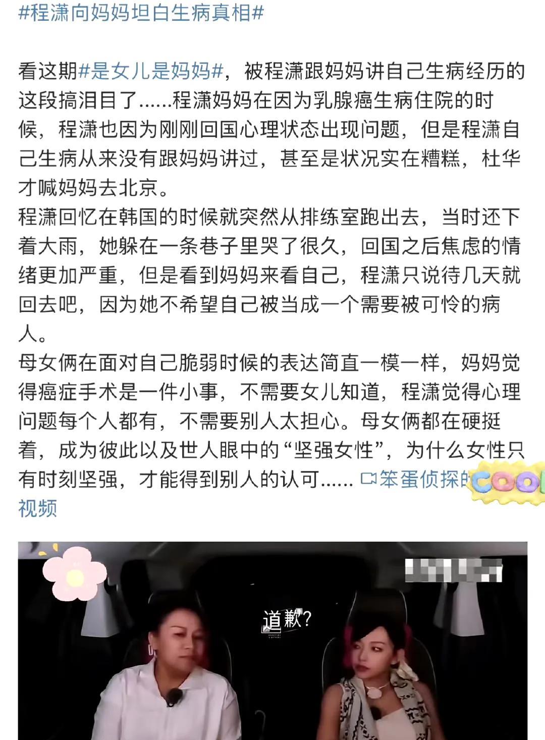 看《是女儿是妈妈》破防了!程潇自曝在韩国当练习生时曾大雨天躲巷子崩溃大哭,回国后焦虑加重却硬撑不说。 妈妈患乳腺癌也选择独自扛,母女俩默契上演"报喜不报忧"连续剧。 杜华成最大剧透:要不是老板喊妈,这俩"钢铁侠"能互相瞒到地老天荒!原来女明星和妈妈的爱,都是倔强牌创可贴。