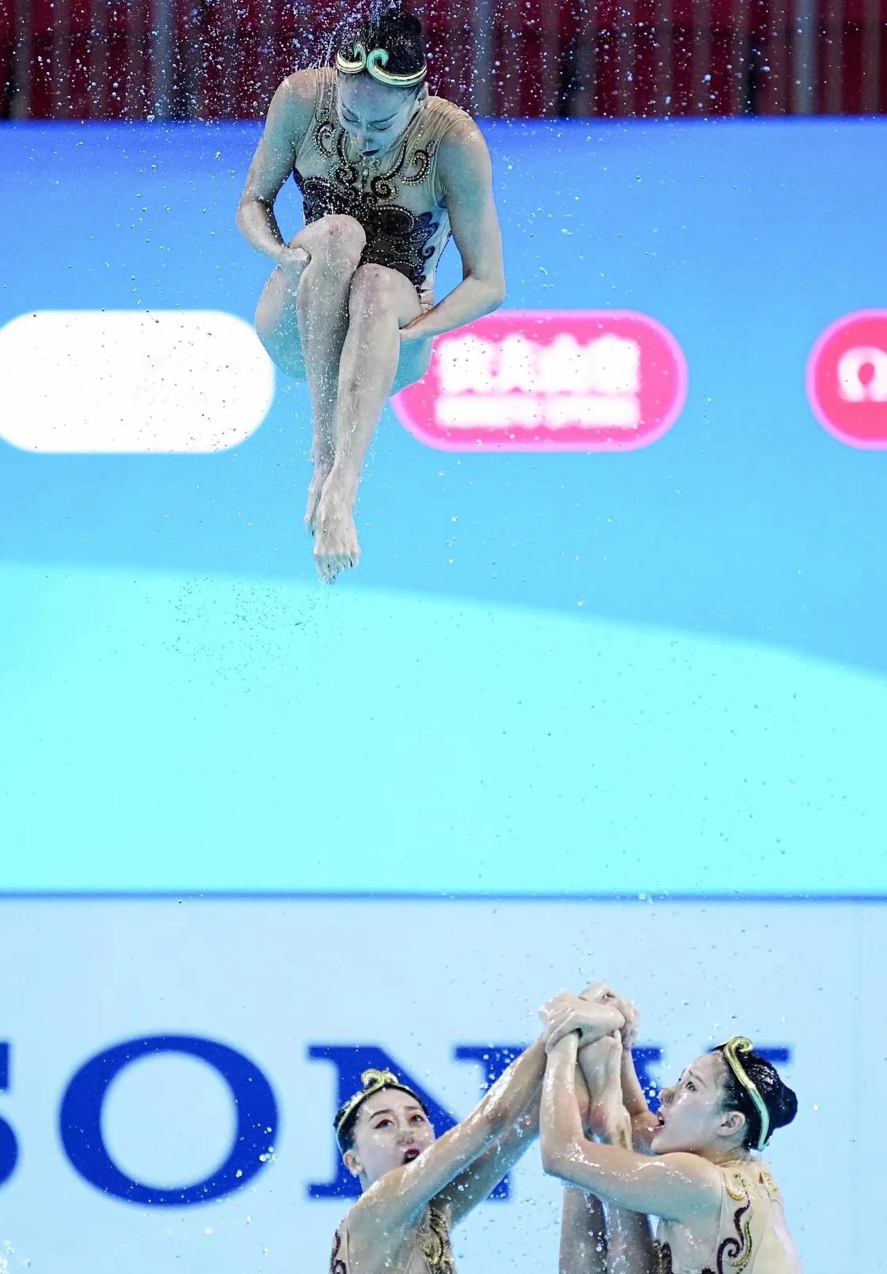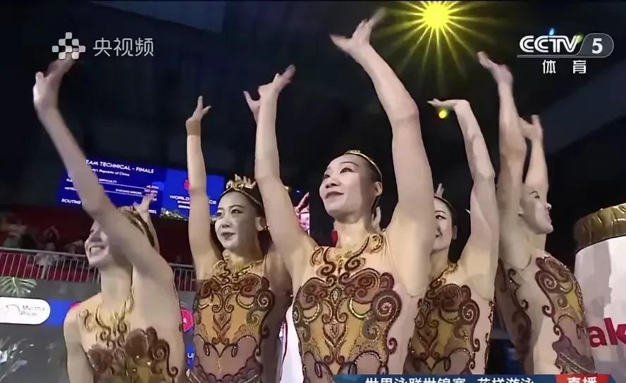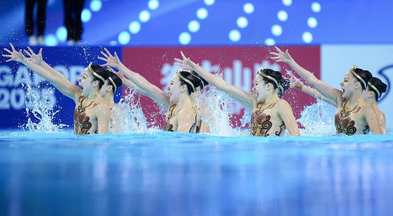 新加坡游泳世锦赛花游集体技术自选决赛,以“金箍”造型伴着《黑神话:悟空》的音乐呈