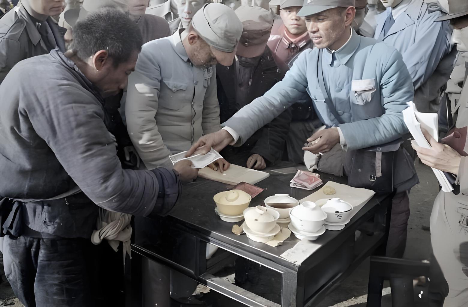 这两张照片记录的是1943年常德战役后,士兵向难民发放救济金的场景