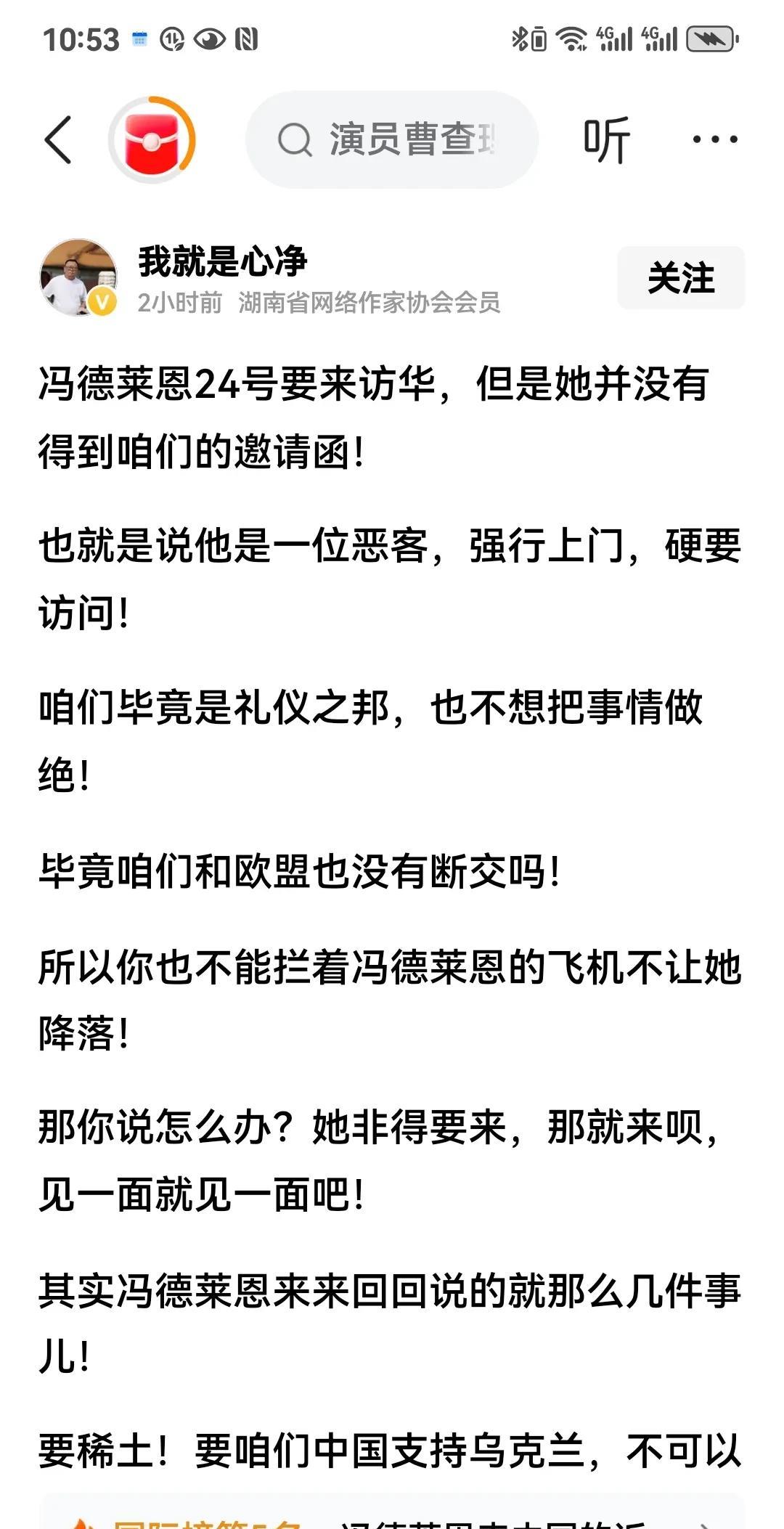 有消息说,欧盟主席冯德莱恩要不请自到,非要强行在24号来我们这里访问。在这里我们