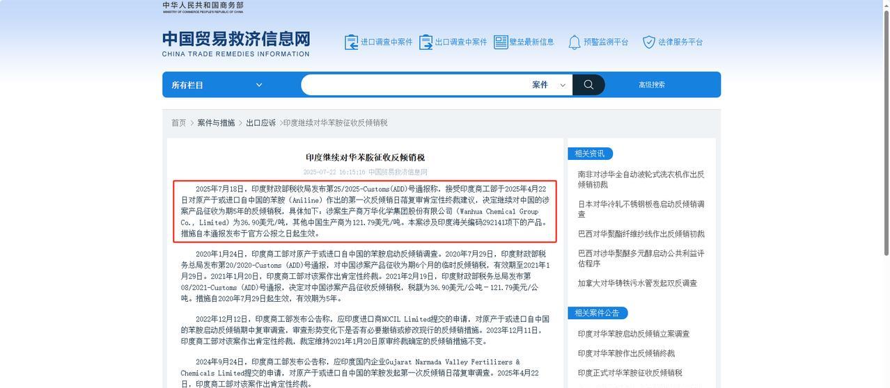 印度对中国苯胺出手了!7月18日,印度财政部宣布对中国进口的苯胺继续征收反倾销税,而且这一征就是五年!最新文件规定,中国龙头万华化学每吨出口需多缴36.9美元关税,其他中国企业更惨,每吨直接加收121.79美元! 这次决定是印度商工部贸易救济总局(DGTR)搞了个日落复审后拍板的,啥叫日落复审?简单讲就是反倾销税快到期时,印度得掂量掂量:这税还收不收?收的话怎么收? 早在2020年,印度本土化工企业,尤其是古吉拉特纳尔马达谷化肥与化工有限公司(GNFC),就跳出来喊话,说中国苯胺低价倾销,害得他们生意不好做,市场份额被抢,利润也缩水。 2021年2月,印度正式开征反倾销税,当时万华化学被定为每吨65.91美元,其他中国企业每吨150.80美元。 到2024年,这税眼看要到期,GNFC又站出来申请续期,DGTR花了几个月查数据、听意见,最终在2025年4月22日得出结论:中国苯胺还在倾销,如果不续税,印度本地企业还得继续吃亏。 为啥印度这么执着?得看苯胺这东西有多重要,它是染料、制药、橡胶助剂等行业的核心原料,印度制造业离不了。 DGTR的调查发现,中国作为全球化工老大,产能巨大,出口价格低得离谱,直接把印度本土企业的产能利用率和利润率压得喘不过气。 2024年数据显示,中国对印度的苯胺出口量还在涨,这让印度更觉得不加税不行,继续征税,等于给GNFC这样的企业撑腰,让他们有底气扩产能、抢市场。 但反过来,印度那些靠进口苯胺的染料和制药厂就头疼了,原料成本一涨,他们的产品价格也得跟着抬,可能在国际市场上没那么好卖了。 2023-2024财年,中印贸易额高达1184亿美元,但印度对中国的贸易逆差足足有850亿美元,中国是印度最大的进口国,化工、电子、制药等领域都少不了中国货。 印度近年来使劲儿用反倾销这招,2024年启动的43项反倾销调查里,34项冲着中国来的,占比快八成了! 这次苯胺只是其中一环,印度还给中国贴了个“非市场经济”的标签,说中国企业定价不透明,出口价低于国内价,算倾销。 华化学这次还算是“幸运”的,每吨36.9美元,比之前的65.91美元还低了点,可能是因为它在全球化工圈地位高,出口行为也相对规范。 其他中国企业就没这么好运了,每吨121.79美元的税率虽然比之前的150.80美元略降,但还是高得吓人,这税率差别明显是DGTR在调查中对不同企业区别对待的结果。 五年长跑开始后,中国企业得好好想想对策了,像万华化学这样的巨头,可能靠规模和技术优势,调整下供应链,把产品多卖到东南亚或欧洲去,影响还能消化,可中小型企业就难了,高关税可能直接让他们放弃印度市场。 中国是苯胺生产大户,出口能力强,印度这一加税,可能逼着中国企业换个地方卖货,比如东南亚、非洲,或者干脆在第三国建厂,万华化学在匈牙利的基地可能就派上用场了。 反过来,印度本土企业虽然得了保护,但能不能真把机会抓住,还得看他们能不能在技术上突围、把成本降下来,不然保护期过了,还是得面对中国货的竞争。 对印度来说,这政策是把双刃剑,虽然保护了GNFC这样的企业,短期内市场份额和利润有望回升,但下游企业成本上升,可能会拖累整体制造业的竞争力,加上中印关系本来就微妙,边境问题还没完全解决,贸易摩擦再添一把火,双方想好好合作估计更难了。 中国这边可能也会反击,比如限制对印度的某些关键物资出口,印度那些靠中国进口的行业,比如电子、太阳能、制药,估计得捏把汗。 信息来源:中国贸易救济信息网《印度继续对华苯胺征收反倾销税》