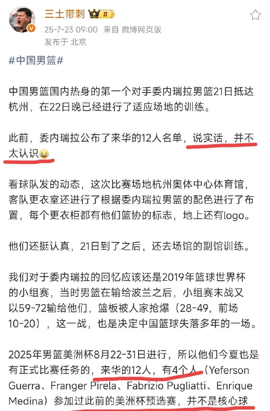 这事挺尴尬!中国男篮和委内瑞拉二队打热身赛,先做个铺垫。中国队赢了,对手是二队就