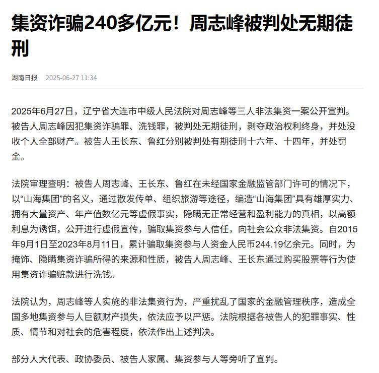 那个靠“免费领鸡蛋”起家,骗走全国60万老人244亿养老钱的大骗子周志峰,在今年6月份,终于栽了!法院判了他无期徒刑,钱和东西全没收。 周志峰的骗局十分简单——免费送鸡蛋,在菜市场、小区门口,业务员拿着传单,见着老人就说凭身份证能领鸡蛋、大米或者面粉,老人家觉得占了大便宜,乐呵呵留下电话、身份证号,殊不知已经掉进坑里。 接下来,业务员就开始邀老人去听啥“健康养老”或者“科学旅居”的讲座,现场气氛那叫一个温馨,讲师管你叫“家人”,嘘寒问暖,聊得你心花怒放,恨不得当场掏钱。 讲座的重点来了,推销所谓的投资项目,吹自己的山海集团多有实力,资产一大堆,年产值好几亿,投他们的养老项目或者药房众筹,能拿8%到30%的回报。 这“保本高息”的说法,精准戳中老人想要稳当投资的心理,不少人把毕生积蓄、拆迁款,甚至抵押房子得来的钱都投进去,寻思晚年能过得更舒坦。 可真相呢?从2015年9月到2023年8月,山海集团靠着发传单、组织旅游,非法吸纳了244.19亿的公众资金,这些钱根本没投到啥正经项目里,周志峰他们拿去买股票、房产,玩起了洗钱的把戏。 所谓的“高回报”就是个庞氏骗局,新投资者的钱用来付老投资者的利息,维持一个虚假的繁荣假象。 受害者大多是60到90岁的老人,人数高达60万,有人把全部养老钱投进去,有人甚至借钱投资,结果骗局一爆,银行卡空了,有的老人连降压药都换成最便宜的,有的住院连押金都凑不齐。 为啥这骗局能得逞?除了高息诱惑,还有对老人心理的精准拿捏,山海集团深知老人孤独,想找点精神寄托,业务员不仅送礼品,还经常打电话问候,记下老人生日,搞得跟家人似的,这种“情感绑架”让老人彻底放下戒心,心甘情愿掏钱。 调查说,80%的受害者都是因为“免费领鸡蛋”留了信息,才被盯上的,他们还打着“国家支持养老产业”的旗号,骗老人以为投资有保障,甚至组织免费或低价旅游,带老人去看所谓的“公司资产”,让信任感再上一层楼。 这些“温情”手段,其实就是步步为营的圈套。 判决那天,周志峰被判无期,财产全没,算是给了受害者一个交代,公安已经开始追赃,涉及的资金、股票、房产、车辆都在清查,判决生效后会依法还给受害者,可244亿的巨款追回多少真不好说。 信息来源:湖南日报《集资诈骗240多亿元!周志峰被判处无期徒刑》