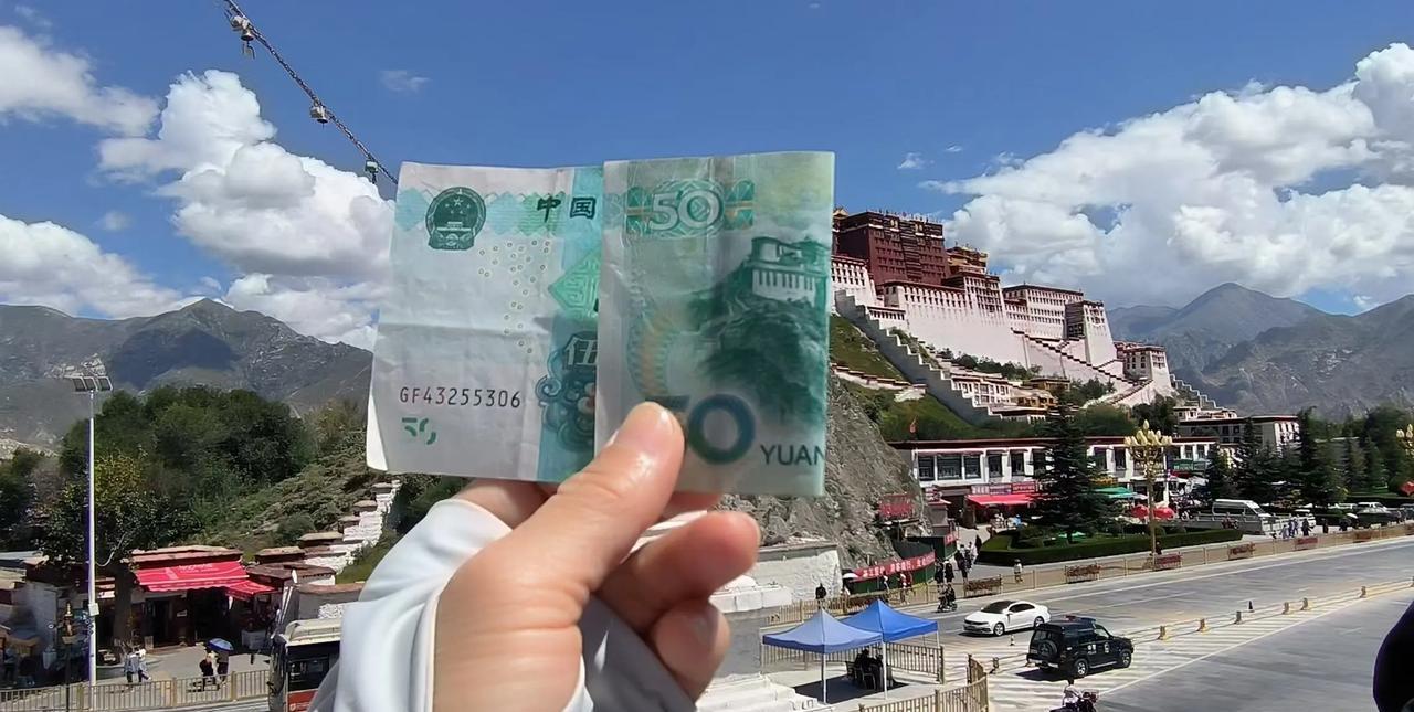 龙队来到拉萨, 举着50元人民币, 是布达拉宫最佳观赏位, 前年去的时候也在这里