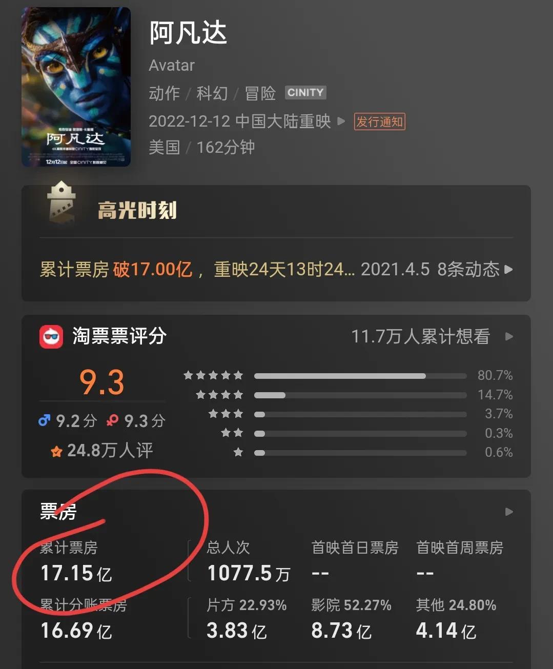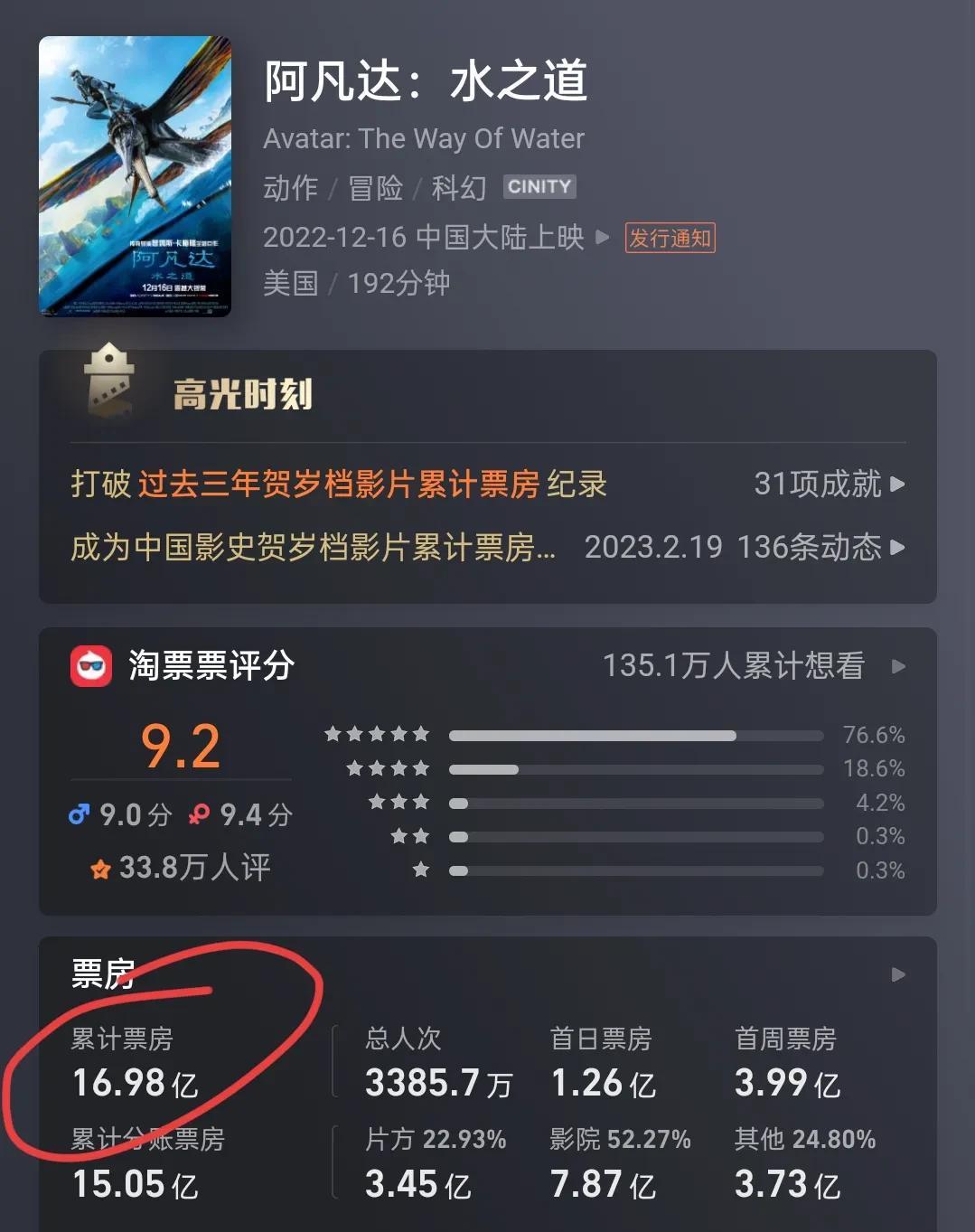 《阿凡达3》预告终于放出来了,这部让卡梅隆妻子从头哭到尾的电影,到底还能不能吸引国内观众呢?卡梅隆说是系列里的最佳,吹牛了?还是真如此? 现在大家对于特效似乎已经不那么热衷,反而更多的是关注故事内容,尤其是近些年好莱坞影片质量非常差的情况下,对于《阿凡达3》的要求自然提高了许多,尤其是故事,最好真的让大家哭。 第一部关注点在森林,第二部关注点在水里,第三部关注点又会是什么?预告片里,奈蒂莉和灰烬族首领激烈交锋,还有很多绮丽震撼的新景色也首次公开,或许会有不一样的观影体验。 《阿凡达1》国内票房17.15亿 《阿凡达2》国内票房16.98亿 那么,《阿凡达3》又能有多少票房呢?能破20亿吗?要不,去春节档试试?