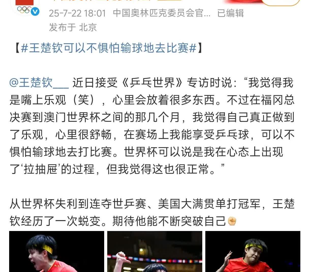 人民日报发文,奥林匹克委员会发文,再赞👍王楚钦! 奥林匹克委员会18:01,人民日报18:03,前后只差2分钟,几乎是同时发文,就像商量好了一样,再赞王楚钦。 他说:世界杯心态上出现了“拉抽屉”的过程。 怎么说呢? 可能因为世界杯输给了雨果,会陷入摇摆不定,自我怀疑的怪圈。 多哈夺冠确实是一次华丽的蜕变。对状态和信心都有了巨大的提升。 未来会越来越好。