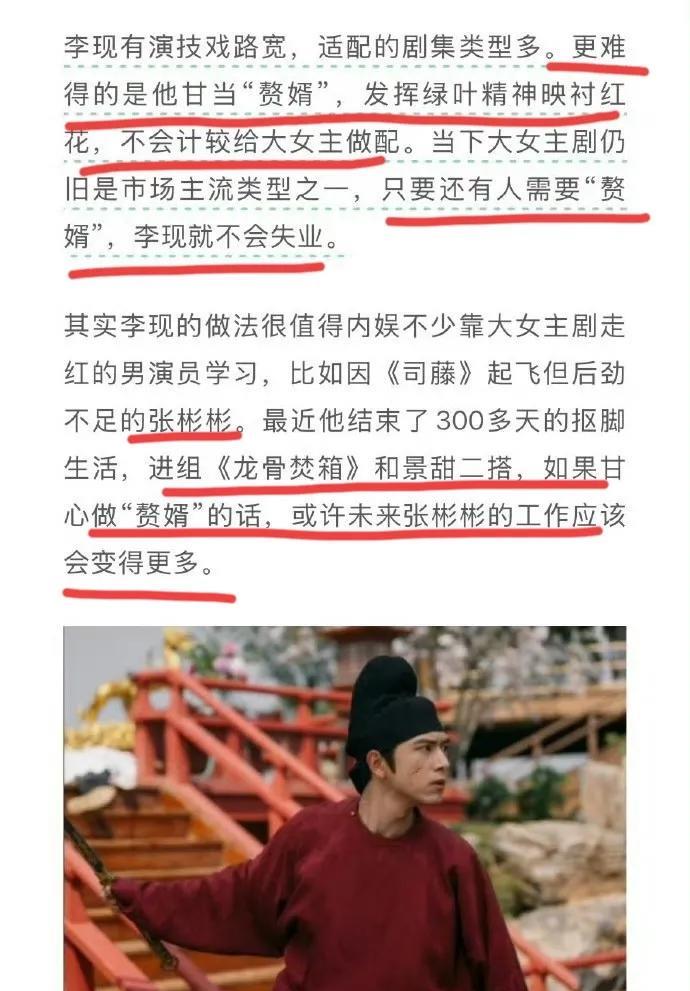 我天,李现得罪谁了啊!!! 自从演完《锦绣芳华》就一直被嘲“赘婿”,现在腾讯娱乐又发了一篇文章,直接说他甘心当赘婿,给大女主作配。 还说只要还有人需要“赘婿”,李现就不会失业!! 我天,我怎么感觉这种说法有点过分了啊,太不尊重李现了吧! 除此之外,文中还提到张彬彬,说如果他也愿意当赘婿,未来工作机会会更多。 我觉得内娱真是疯了!