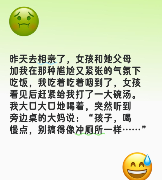 昨天去相亲了,女孩和她父母加我在那种尴尬又紧张的气氛下吃饭,我吃着吃着咽到了,女孩看见后赶紧给我打了一大碗汤。我大口大口地喝着,突然听到旁边桌的大妈说:“孩子,喝慢点,别搞得像冲厕所一样……”