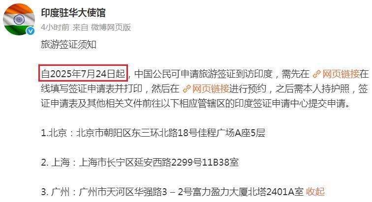 神奇,雅鲁藏布江电站刚开工,印度就来示好了! 今天下午,印度驻华大使馆在官微放出消息,恢复向中国公民发放旅游签证,而之前的暂停可是发生于5年前,当时印度还挺霸道的,一直就这么停着。 现在呢,雅鲁藏布江电站刚开工没几天,暂时还看不到实在的东西,倒是先让印度学乖了,主动来修复关系。 当然,有人会说印度的服软和雅鲁藏布江电站没关系,而是印度当前国内外局势不大好。 但是,以印度一贯的脾气,得理不让人,没理也搅三分,如果印度不是被5月份的印巴空战打疼了,不是被雅鲁藏布江电站搞蒙了,它现在不会这么乖的。 也许,印度真的感受到真理在霹雳15的射程范围之内,在电站的管控影响范围之内了。 只是,从旅游角度看,印度有什么可看可玩的呢?难道要去感受它的脏乱差吗?难道要去挑战自己的免疫系统吗?!