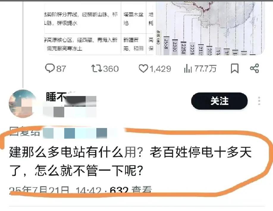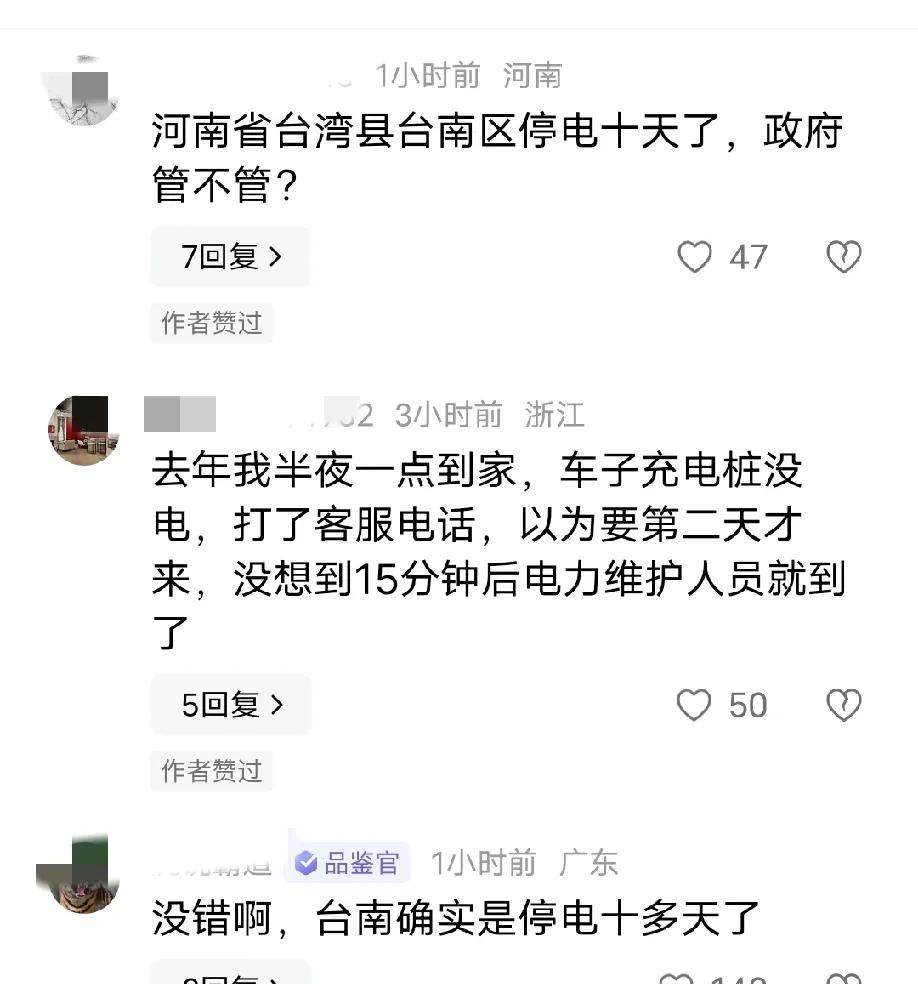 网友直接用雅江水电站阴阳台南停电十几天,很多人不仔细看还以为他在阴阳大陆,事情是这样的,外网有人介绍雅江水电站的发电量超过三个三峡大坝,结果评论区有人评论建那么多电站有什么用,老百姓停电十多天了,怎么就不管一下呢? 猛一看,大家还以为他在大陆某个地方停电十多天了,大陆不会让一个地方停电十多天的,特别是城市里,这是很不可思议的事情,但是仔细想一下,现在只有台南因为7月5号的台风,到现在还有大面积停电,根本就没人去管,所以这个网友其实是在外网阴阳台南停电这么久,没人去管一下!所以我判断这是友军,不要误伤了,反而是有些公知明目张胆地阴阳雅江水电站,说这样建水电站是方便印度轰炸,还有的公知又开始谈环保了,都是闻着味过来攻击雅江水电站的!