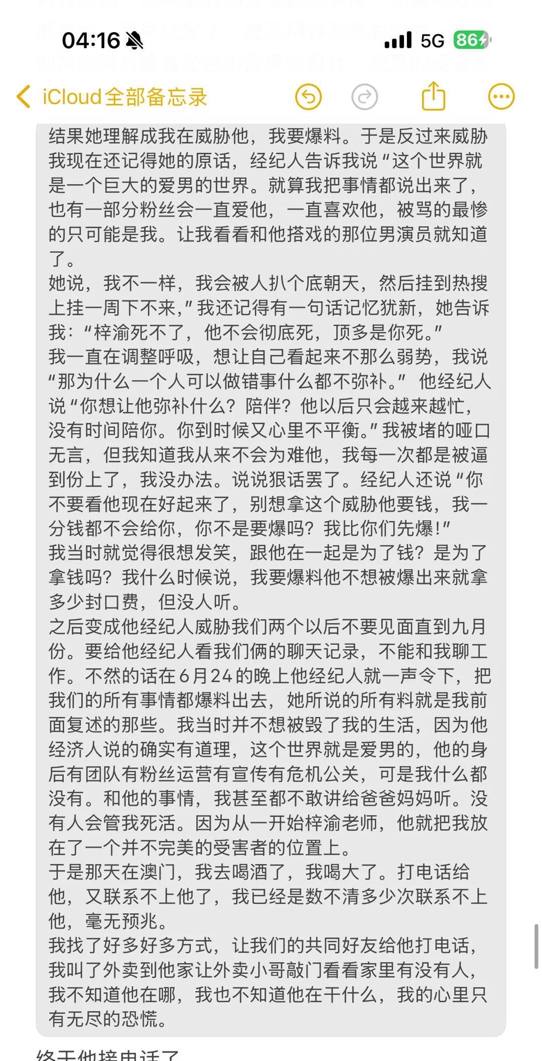 大半夜吃了个大瓜! 最近很火的梓渝, 原来是这么一个烂人啊! 据其女朋友的爆料, 简单总结一下梓渝这个人—— 女方因多次联系未果, 才被迫选择公开爆料逼其现身! 就这样一个渣男, 一群无脑粉还在给他洗白呢, 说梓瑜回应真诚是真男人!期待新歌! 真是应了他前女友, 也就是他的经纪人说的一句话: 这个世界就是一个巨大的爱男的世界。 就算把事情都说出来, 也有一部分粉丝会一直爱他,一直喜欢他。 看,这就是娱乐圈!