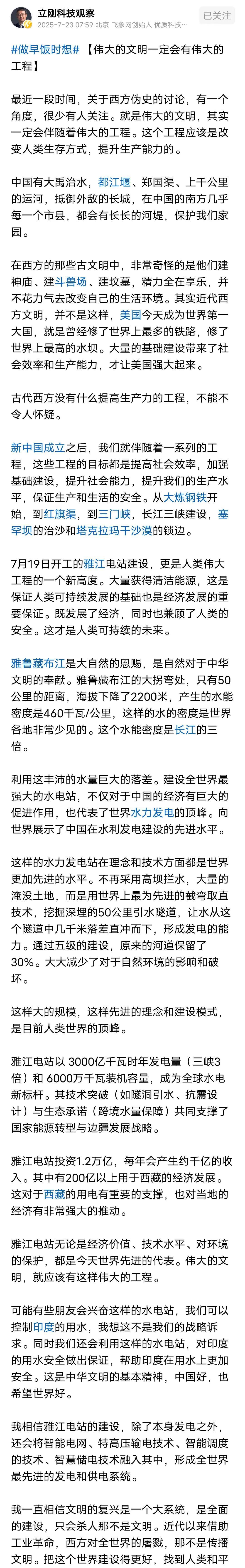 项立刚表示伟大的文明一定会有伟大的工程,雅鲁藏布江水电站是人类伟大工程的一个新高度! 确实是这样的,按照公知的的说法,西方历史多么文明,按理应该有不少利国利民的伟大的工程,好像基本都没有,西方好像都是一些宗教类的东西,而我们有长城,都江堰,郑国渠,还有京杭大运河,现在的三峡大坝,南水北调,粤港澳大桥,还有刚刚开工的雅鲁藏布江水电站,西方没有一个可以匹敌的历史工程!真不知道它的历史文明在哪里?